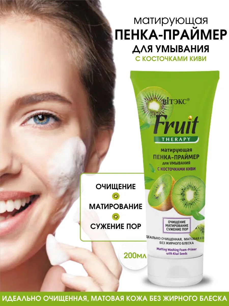 FRUIT Therapy Mattifying Foam Primer. This foam primer is based on special mild cleansing agents, as well as natural kiwi seeds and delicate polishing particles, which provide the skin with thorough multi-level cleansing: they gently exfoliate dead skin cells, deeply cleanse pores of impurities and blackheads, eliminate oily shine for a long time, give the skin freshness, an even tone and a velvety matte finish.