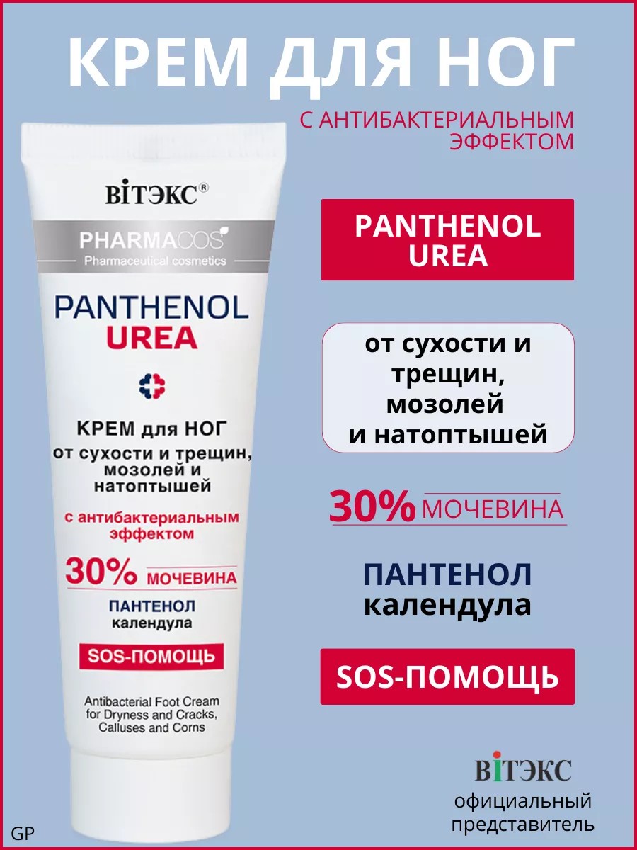 Крем для ног от сухости и трещин, мозолей и натоптышей с антибактериальным эффектом Pharmacos PANTHENOL UREA - 30% мочевина, пантенол, календула. Крем для ног Panthenol UREA глубоко увлажняет кожу, питает и восстанавливает благодаря пантенолу и календуле. Белорусская косметика крем для ног с мочевиной для пяток помогает избавиться от трещин на пятках. Крем от натоптышей помогает сделать гладкие пяточки благодаря пантенолу, календуле и мочевине. Витэкс крем отличное средство от натоптышей, от трещин и мазолей.