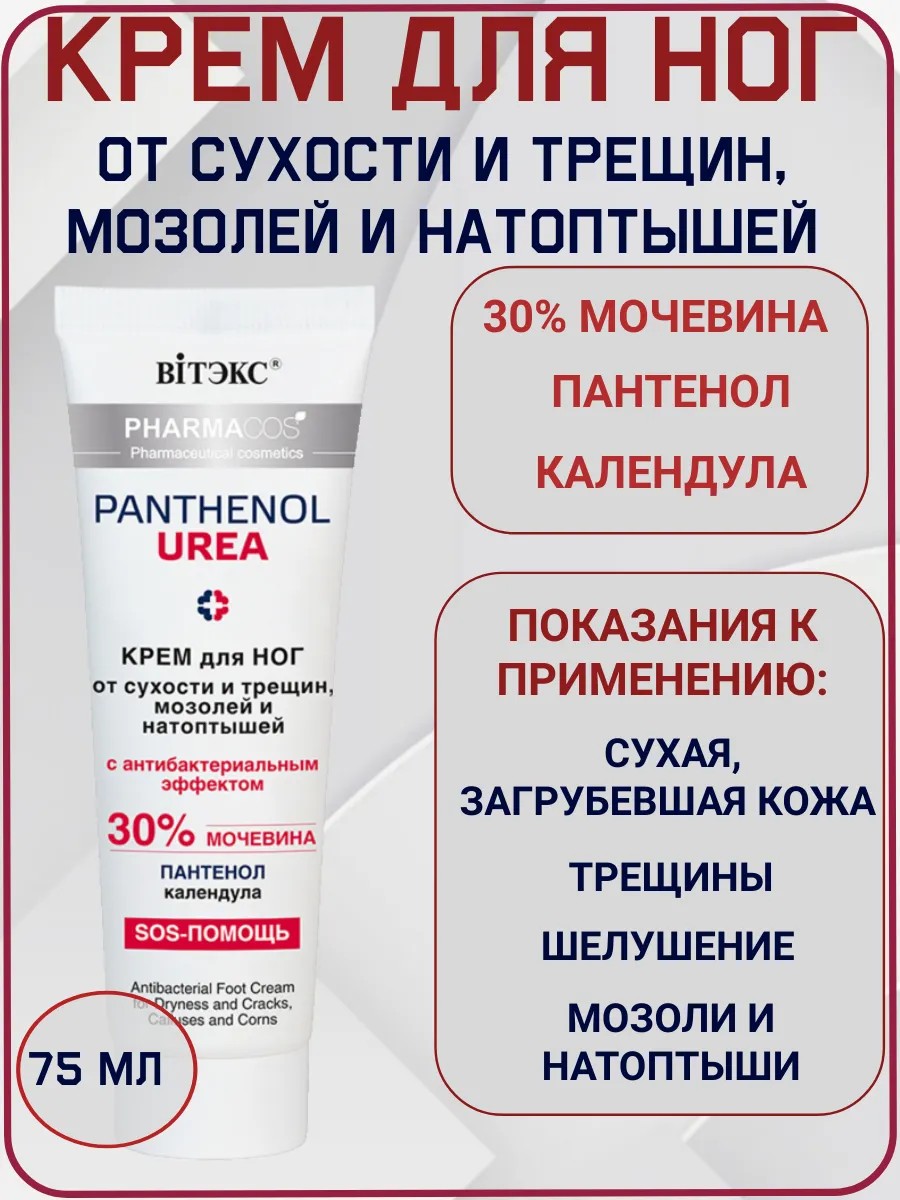 Крем с высокой концентрацией компонентов особенно рекомендуется для интенсивного восстанавливающего ухода за кожей ног, склонной к сухости и ороговению. Активная формула содержит 30% мочевины (Urea), которая превосходно увлажняет и смягчает кожу, препятствует пересушиванию, предотвращает образование избыточного ороговения, защищает кожу от появления трещин, мозолей и натоптышей. Пантенол (Panthenol) активно восстанавливает кожу, моментально устраняет сухость, стянутость и шелушение, ускоряет заживление трещин.Календула лекарственная (Calendula officinalis) оказывает бактерицидное и дезинфицирующее действие, препятствуя воспалению трещин.Дополнительные активные компоненты:Натуральный комплекс незаменимых жирных кислот, витаминов и фитостеролов эффективно успокаивает раздраженную кожу, обладает противозудным и смягчающим эффектом. Ультрапитательные масла жожоба, ши и авокадо в сочетании с ланолином, аллантоином и омега-кислотами 3-6-9 насыщают кожу необходимыми восстанавливающими веществами, укрепляют кожный барьер, увлажняют, оздоравливают и смягчают, защищают кожу от неблагоприятных внешних воздействий окружающей среды. ПРИ РЕГУЛЯРНОМ ПРИМЕНЕНИИ УСТРАНЯЕТСЯ СУХОСТЬ, КОЖА СТАНОВИТСЯ МЯГКОЙ, ГЛАДКОЙ, БЕЗ НАТОПТЫШЕЙ И ТРЕЩИН. Не содержит минеральных масел, спирта, красителей. Гипоаллергенная отдушка.