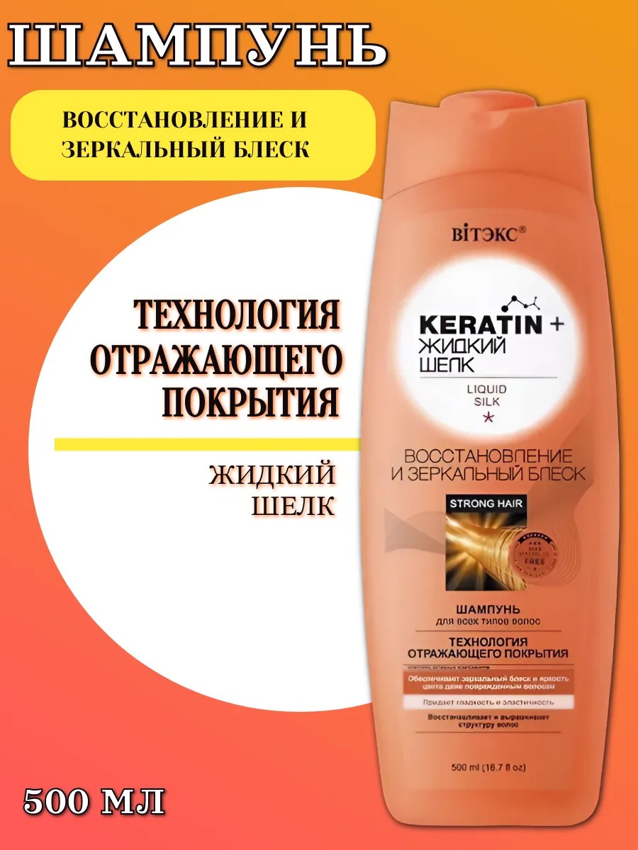 Шампунь Витэкс Keratin&Жидкий шелк Восстановление и зеркальный блеск 500 мл. - бережно очищает волосы, способствуя восстановлению и выравниванию их структуры, заполняя поврежденные участки.