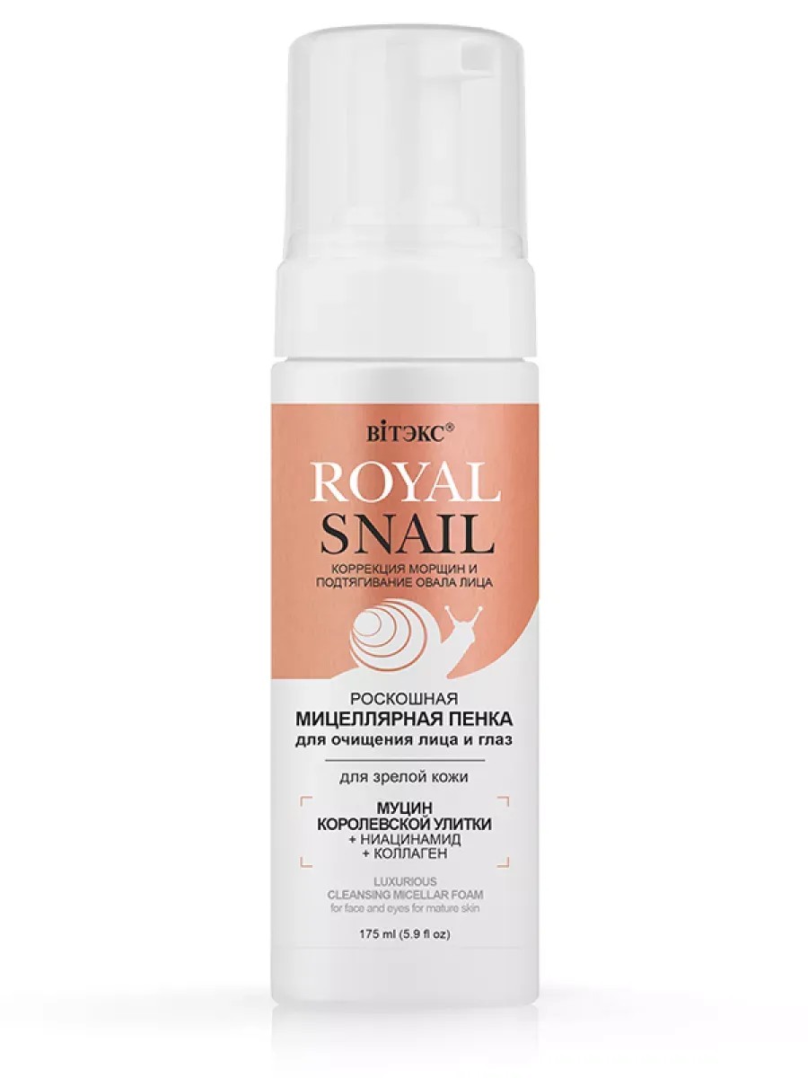 Роскошная мицеллярная пенка для очищения лица и глаз для зрелой кожи ROYAL SNAIL. Нежнейшая, кремовая, воздушная пенка подарит Вашей коже великолепное очищение и превратит процедуру умывания в изысканное чувственное удовольствие.