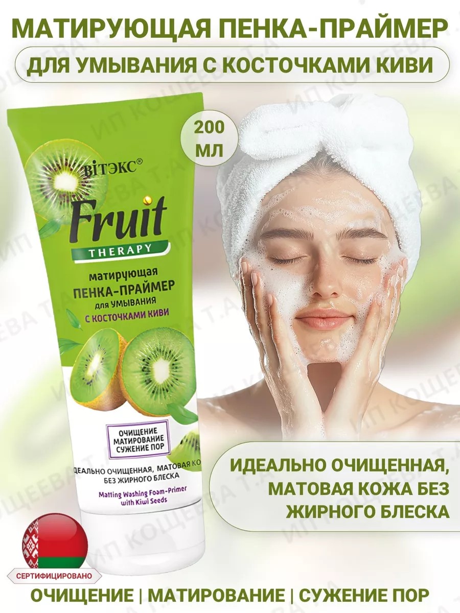 Matifying Cleansing Foam Primer with Kiwi Seeds from Vitex. This foam primer is formulated with special mild cleansing agents, natural kiwi seeds, and delicate polishing particles to provide thorough, multi-level cleansing: it gently exfoliates dead skin cells, deeply cleanses pores of impurities and blackheads, eliminates shine for a long-lasting glow, and leaves skin feeling fresh, even-toned, and velvety matte. Epidermist, a proven natural ingredient, tightens pores, improves cell renewal, and reduces the growth of bacteria that cause inflammation and redness. The result is perfectly clean, smooth, and velvety skin that retains its freshness and matte finish for a long time. Directions: Apply to damp skin, avoiding the eye area, massage in, and rinse with water. Recommended use 2-3 times a week. Ingredients: Water, Cocamidopropyl Betaine, Sodium Laureth Sulfate, PEG-40 Hydrogenated Castor Oil, Trideceth-9, Acrylates/C10-30 Alkyl Acrylate Crosspolymer, Phenoxyethanol, Methylparaben, Ethylparaben, Propylparaben, Silica, Sodium Hydroxide, Actinidia Chinensis (Kiwi) Seed, Parfum (Fragrance), 2-Bromo-2-Nitropropane-1,3-Diol, Plankton Extract, CI 19140, CI 42090, CI 47005.