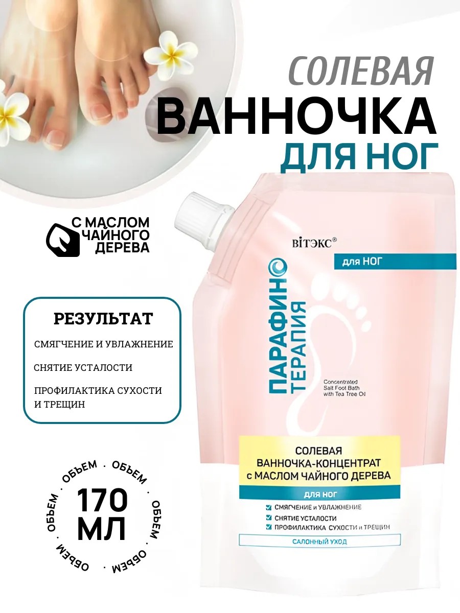 Солевая ванночка-концентрат с маслом чайного дерева для ног Смягчение и увлажение, снятие усталости, профилактика сухости и трещин. ПОКАЗАНИЯ К ПРИМЕНЕНИЮ: кожа, склонная к трещинам, уплотнению и ороговению сухая, шершавая, загрубевшая кожа потливость ступней эффект "усталых ног" подготовка к педикюру расслаивание и ломкость ногтей профилактика сухости и трещин Целебные компоненты Масло чайного дерева оказывает антибактериальное действие, тонизирует, ускоряет заживление микротрещин, способствует уменьшению потливости. Жидкий парафин - высокоэффективный компонент, который используется в профессиональных косметических салонах для ухода за кожей ног. Благодаря уникальным свойствам, он обеспечивает быстрые видимые результаты, чтобы надолго вернуть коже превосходную гладкость, мягкость и ухоженный вид. Жидкий парафин создает невесомую окклюзивную дышащую пленку, которая препятствует пересушиванию, и кожа длительное время остаётся увлажненной, напитанной, мягкой и нежной.