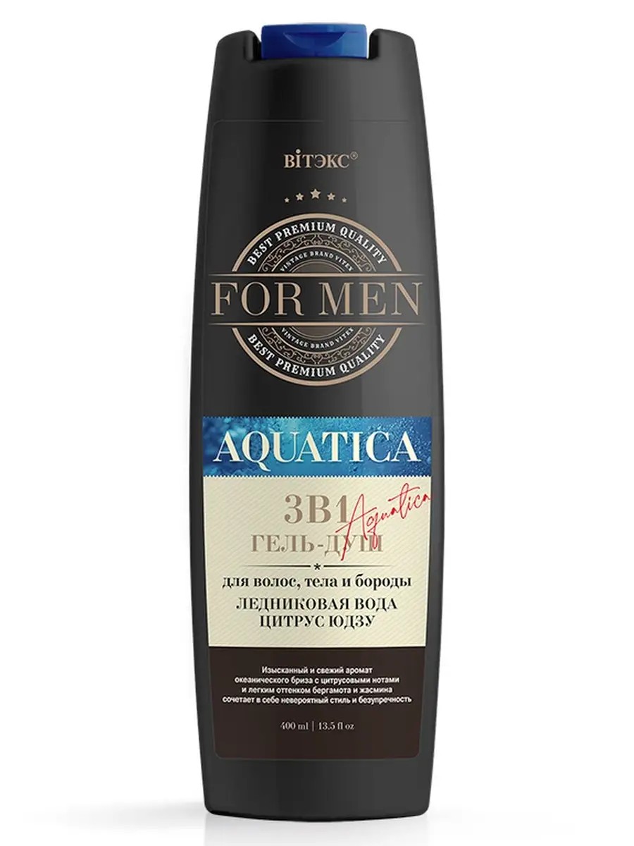 Витэкс ГЕЛЬ-ДУШ 3в1 для мытья волос, тела и бороды ЛЕДНИКОВАЯ ВОДА и ЦИТРУС ЮДЗУ For MEN AQUATICA, 400 мл. Гель-душ 3в1 идеально подходит мужчинам с характером, которые знают толк в хороших ароматах, он подчеркивает уверенность и энергичность, передает настроение азарта, элегантности и легкого флирта. Богатый состав активных компонентов обеспечивает сбалансированный уход за кожей и волосами: Инновационный компонент HYDROVANCE дарит коже превосходное увлажнение, улучшает ее эластичность. Флорапон франжипани питает и укрепляет кожу и волосы, тонизирует, снимает раздражение, ускоряет процессы регенерации. Аллантоин увлажняет и восстанавливает, способствует устранению перхоти. Воздушная кремовая пена безупречно очищает кожу и волосы, увлажняет и смягчает, дарит невероятную свежесть и ощущение чистоты, что делает его идеальным как для утреннего бодрящего душа.
