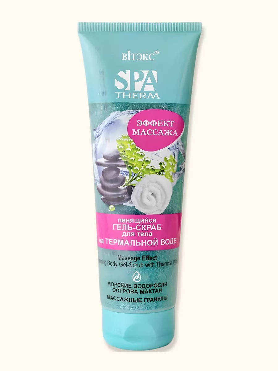 Foaming Thermal Water Body Gel Scrub "Massage Effect", 250 ml. Experience inspiring freshness and a surge of energy... A complex of active ingredients: provides a relaxing massage effect; stimulates collagen production; moisturizes and firms. Transform your daily shower routine into pure pleasure. This gel scrub is the ideal product, which, thanks to its pleasant massage effect, helps quickly relieve drowsiness, fatigue, or tension, imparts a feeling of cleanliness and lightness, and promotes a surge of strength and energy. A special cleansing base neutralizes the hardness of tap water and perfectly cleanses the skin without overdrying it and preserving its natural protective barrier. Thermal water, a natural source of life-giving moisture, provides the skin with the necessary hydration, improves its elasticity, and leaves it soft and radiant. Massage granules of natural origin gently yet effectively polish the skin, improve blood circulation, and provide a lymphatic drainage effect. Mactan Island seaweed deeply moisturizes the skin, infuses it with vitamins, stimulates collagen and elastin production, prevents sagging, and provides an invigorating and toning sensation of immersion in the sea waves. Directions: Apply to damp skin, massage into a lather, and rinse with water.