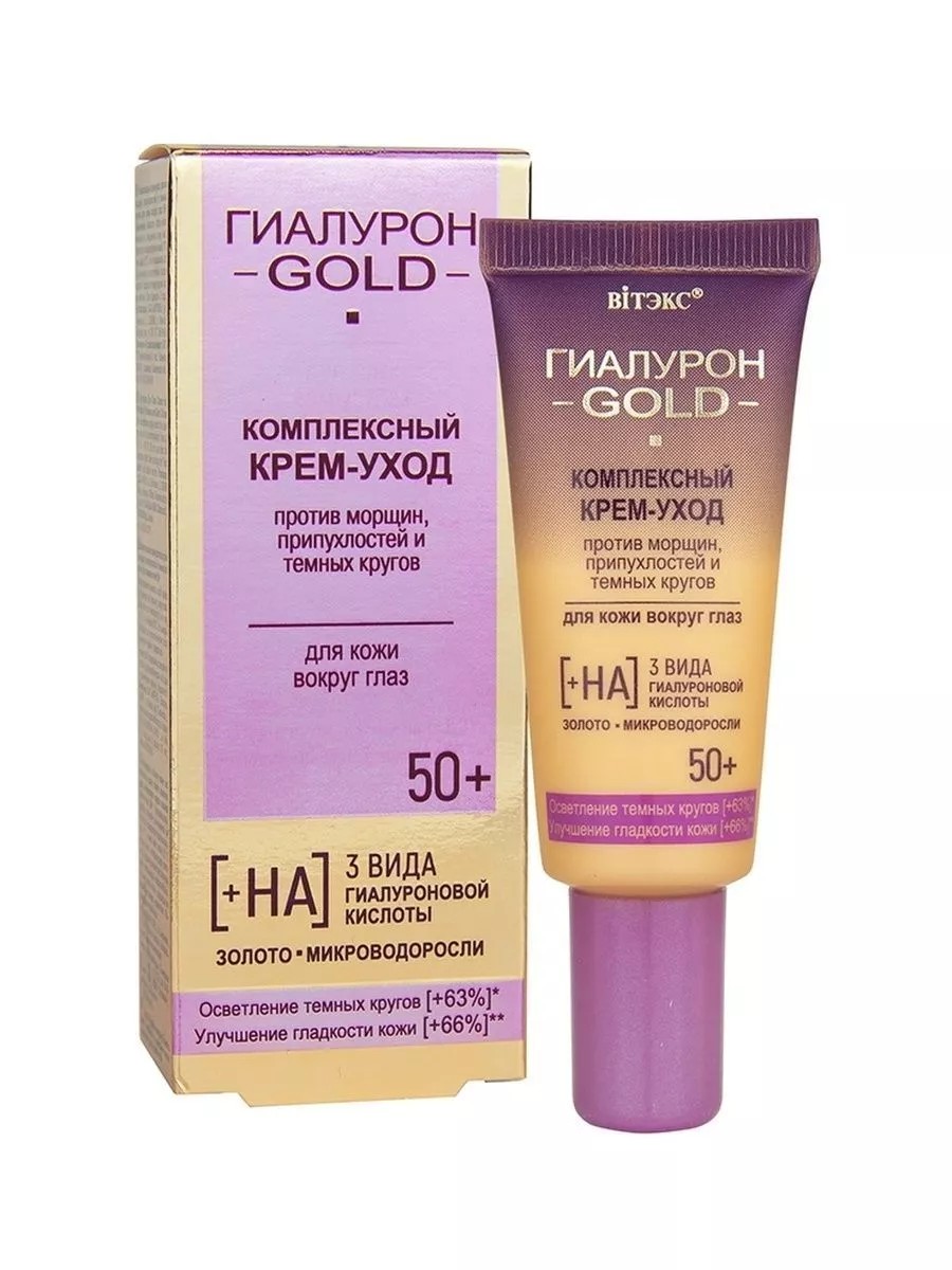 Комплексный крем-уход разработан с учетом особенностей и потребностей кожи в возрасте после 50 лет. Современная интеллектуальная формула, в составе которой 3 вида гиалуроновой кислоты, биозолото, микроводоросли, масло ши, сквалан и умные омолаживающие и осветляющие комплексы, прицельно воздействует на главные признаки старения кожи: гусиные лапки, темные круги, припухлости, опущение верхнего века, преображая нежную кожу вокруг глаз каждый день.Эффект разглаживания морщин возникает мгновенно и сохраняется в течение всего дня благодаря особым лифтинг-компонентам, которые образуют на коже невидимую поддерживающую микросеточку-корсет.Доказанная эффективность компонентов:Увеличение синтеза собственной гиалуроновой кислоты* +93%Осветление темных кругов** +63%Улучшение гладкости кожи* +66%Стимуляция синтеза коллагена* +21%Гиалуроновая кислота трех молекулярных размеров проникает во все слои эпидермиса, активизируя глубокий клеточный метаболизм и возрождая ресурс молодости кожи.1. Высокомолекулярная гиалуроновая кислота увлажняет кожу в верхних слоях, подтягивает, выравнивает ее тон, дарит свежесть, яркость и сияние.2.Среднемолекулярная гиалуроновая кислота проникает в средние слои кожи, стимулирует выработку собственной гиалуроновой кислоты, повышает упругость, плотность и эластичность кожи.3. Низкомолекулярная гиалуроновая кислота действует в самых глубоких слоях эпидермиса, наполняя кожу влагой и выталкивая морщинки изнутри, укрепляя и подтягивая кожу, обеспечивает мощный омолаживающий эффект пролонгированного действия.