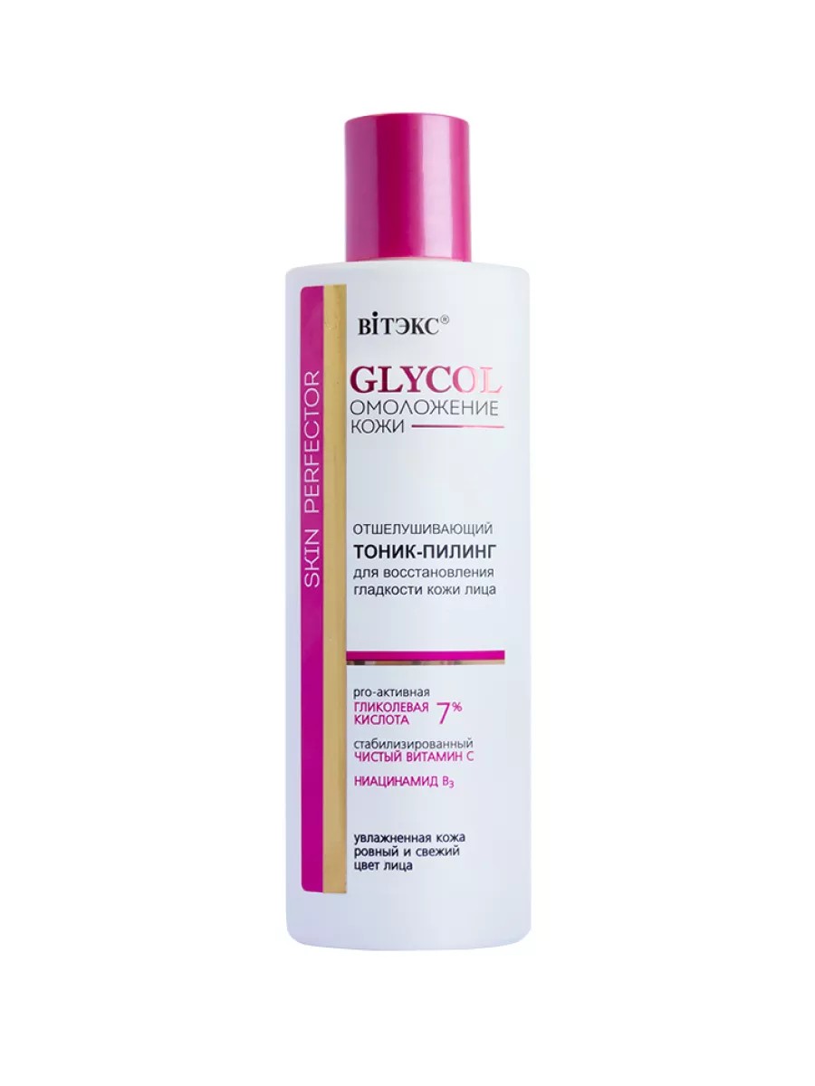 Glycolic tonic-booster from the Belarusian brand of decorative and care cosmetics Biteks (Vitex) with a rich composition of active ingredients gently exfoliates dead skin cells, restoring the smoothness and silkiness of the skin, moisturizes and improves tone.