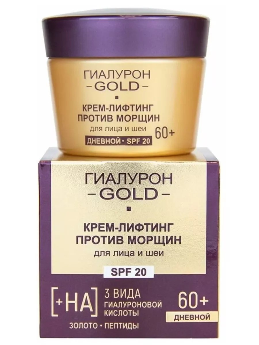 Hyaluron Gold Anti-Wrinkle Lifting Cream for Face and Neck, SPF 20, Day 60+. This rejuvenating lifting cream is designed specifically for the specific needs of skin aged 60+. Its modern, rich formula, based on three types of hyaluronic acid, includes biogold, peptides, and precious jojoba oil.