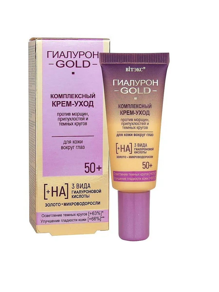 Комплексный Крем-уход против морщин,припухлостей и темных кругов для кожи вокруг глаз.Разработан с учетом особенностей и потребностей кожи в возрасте 50+.Умная формула, в составе которой 3 вида гиалуроновой кислоты, биозолото, шелковая акация и сложные высоконаучные омолаживающие и осветляющие комплексы оказывают направленное действиена все признаки возраста:уменьшает мимические и глубокие морщинки вокруг глаз, снимает отечность, подтягивает кожу верхнего и нижнего века, осветляет темные круги, освежает взгляд.Сразу после нанесения кремамгновенно возникает эффект подтяжки, который сохраняется в течении всего дня.Особые лифтинг - компоненты образуют на коже невидимую поддерживающию микросетечку-корсет против морщин .