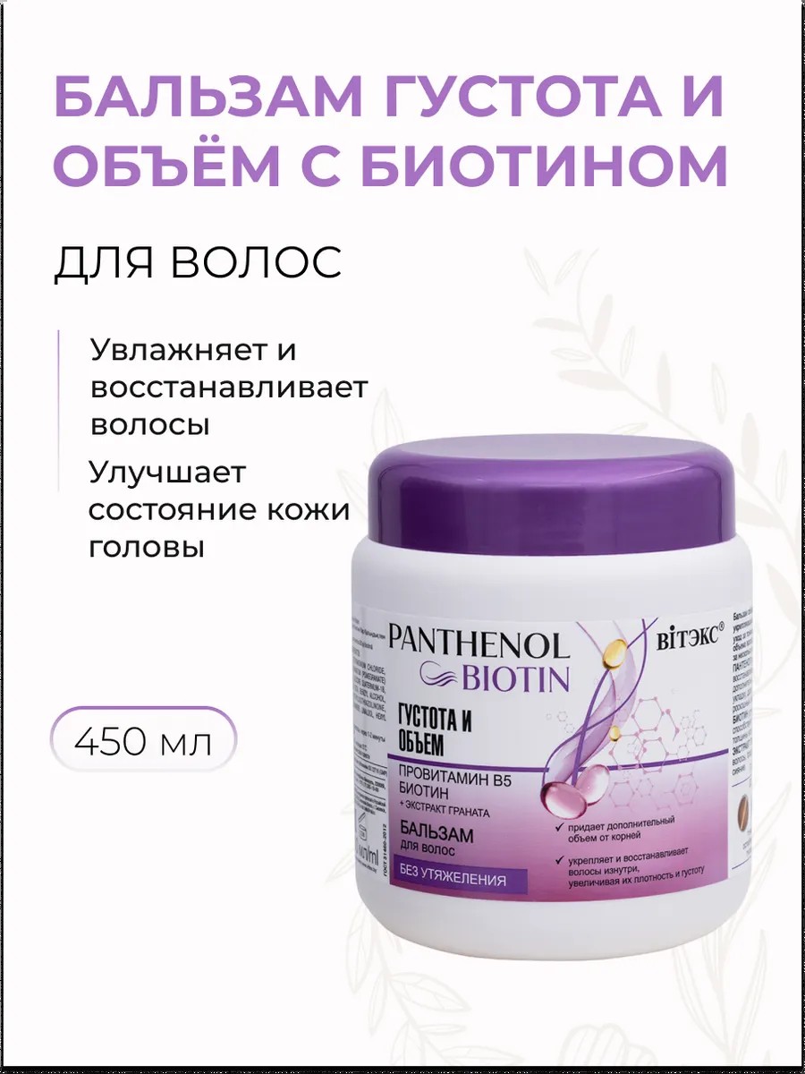 | Полное наименование товара | Бальзам для волос Густота и объём с биотином и витамином В5, Panthenol and amla oil, 450 мл |