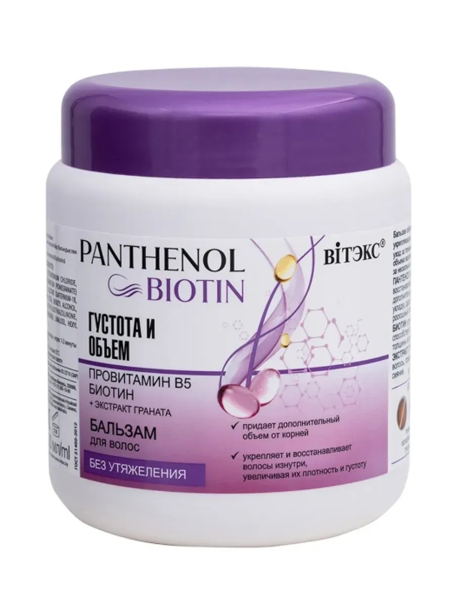 Бальзам для волос густота и объем провитамин В5, биотин «PANTHENOL для волос» от белорусского бренда Витекс — это идеальное решение для тех, кто мечтает о здоровых и объемных волосах. Профессиональный бальзам обеспечивает полноценный укрепляющий и оздоравливающий уход за тонкими, ослабленными, лишенными объема волосами, позволяет преобразить их всего за несколько минут. Уходовая косметика для волос уход пантенолом (провитамин В5) увлажняет и восстанавливает волосы, придает им дополнительную густоту и плотность, облегчает укладку, дарит волосам глянцевый блеск и роскошный объем. Биотин улучшает состояние кожи головы, способствует увеличению количества, объема и толщины волос, уменьшает выпадение. Уход за волосами с экстрактом граната оздоравливает и укрепляет волосы по всей длине, придает пышный объем и красивое сияние. Бальзам для волос увлажняющий и восстанавливающий идеально подходит для ежедневного использования. Бальзам для волос женский не только придает густоту и объем, но и заботится о здоровье ваших локонов, делая их более сильными и красивыми. Белорусская косметика "PANTHENOL и BIOTIN" для красивых, прочных, восстановленных, блестящих волос. Выберите бальзам для объема волос от белорусской косметики Vitex и подарите своим волосам роскошный уход!