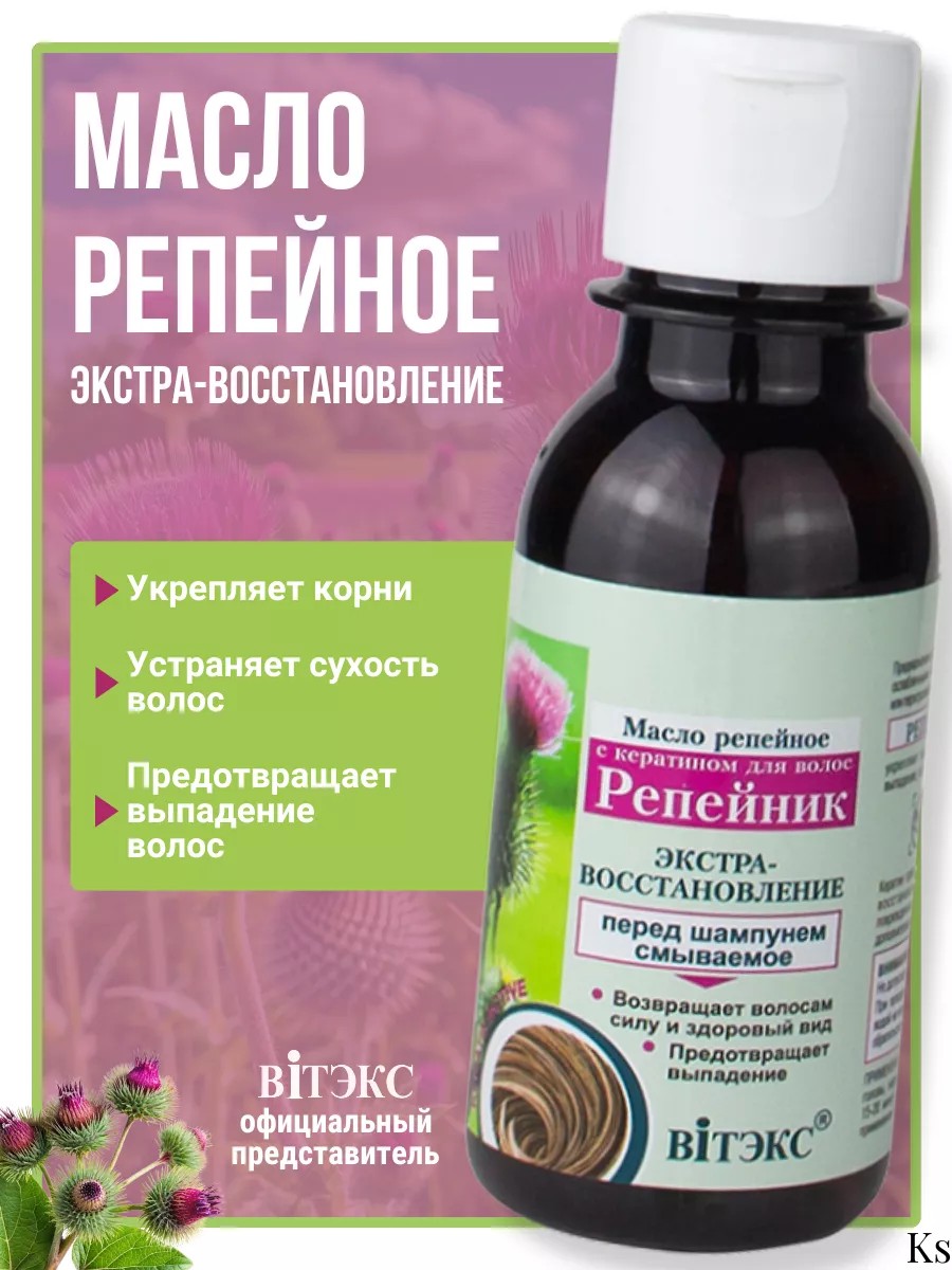 Burdock oil for hair with keratin Extra restoration Burdock against hair loss from the Belarusian cosmetics brand Vitex helps if your hair requires intensive treatment and restoration. Solves the problems of strengthening hair, stimulating growth, giving it strength and vitality.