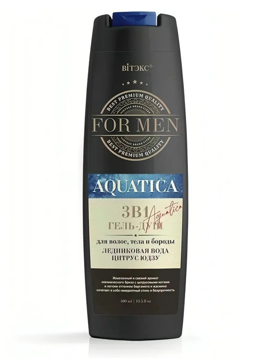 Витэкс Гель душ 3в1 For Men Aquatica, 400 мл - идеально подходит мужчинам с характером, которые знают толк в хороших ароматах, он подчеркивает уверенность и энергичность, передает настроение азарта, элегантности и легкого флирта. Богатый состав активных компонентов обеспечивает сбалансированный уход за кожей и волосами: инновационный компонент hydrovance дарит коже превосходное увлажнение, улучшает ее эластичность.