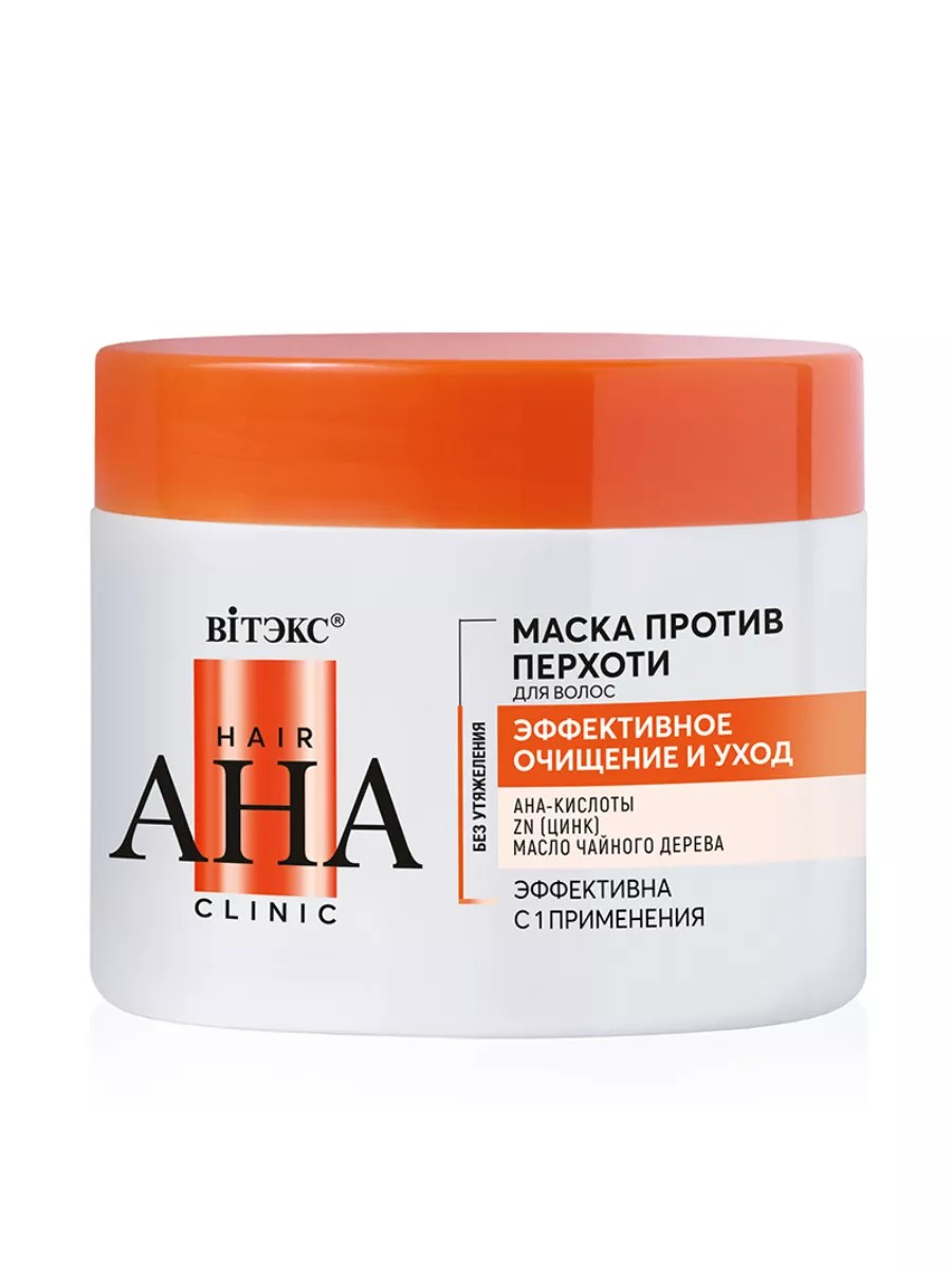 Hair Aha Clinic anti-dandruff hair mask provides effective cleansing and care. Dandruff elimination, reduced itching, and healthy hair. Key results after the first use of the anti-dandruff mask include: visible dandruff elimination, noticeable reduction in itching and irritation, increased skin hydration, long-lasting freshness, beautiful volume, and healthy shine. The formula contains a cascade of special ingredients that help eliminate dandruff and prevent its recurrence, while also providing essential care. Piroctone olamine, one of the most effective anti-dandruff ingredients, helps quickly eliminate dandruff by addressing its underlying causes. Zinc strengthens hair and prevents hair loss. Tea tree essential oil soothes and heals the skin, preventing inflammation and irritation. The antibacterial complex inhibits the growth of microorganisms, normalizes sebum secretion, and has an antiseptic effect. Panthenol relieves itching and irritation, restores and soothes, and adds silkiness and shine. AHA acid complex (lactic, glycolic, and citric) exfoliates dead skin cells and dandruff flakes, moisturizes the scalp, and helps prolong the feeling of freshness and cleanliness in hair. Modern conditioners smooth and thicken hair, making it elastic and manageable, adding beautiful shine and volume. Suitable for sensitive scalps. Directions: Apply to washed, damp hair and scalp, leave on for 7-10 minutes, and rinse with water.