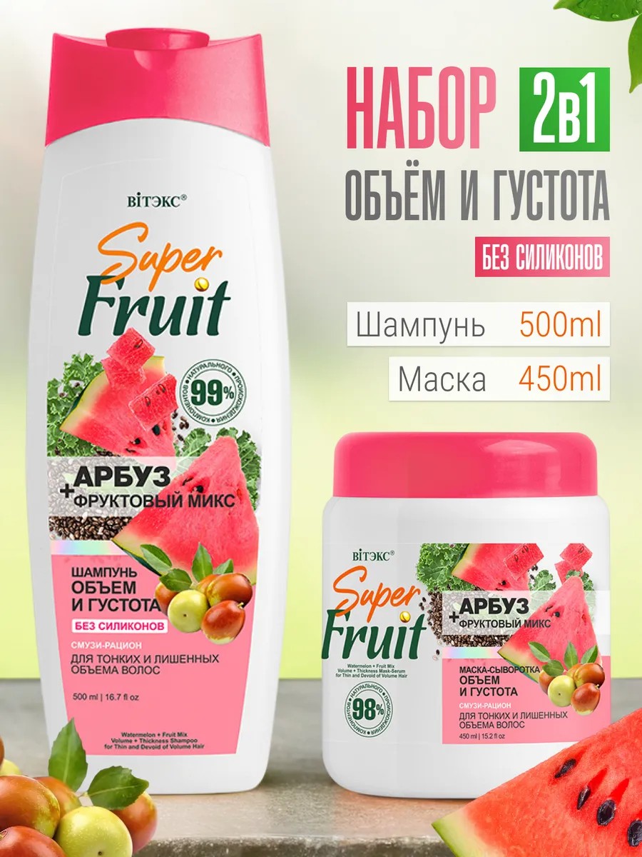 | Полное наименование товара | Набор Арбуз + фруктовый микс шампунь и маска объем и густота для тонких и лишенных объема волос без силиконов |