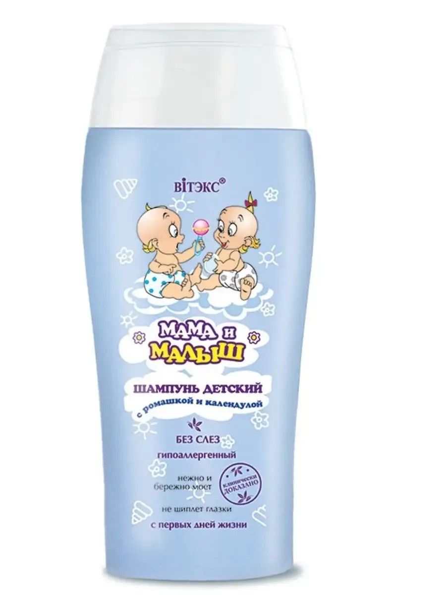 Шампунь детский с ромашкой и календулой «Мама и малыш» от белорусского бренда Витекс — это идеальное средство для ухода за волосами и кожей головы вашего ребенка. Шампунь детский без слез подходит для малышей с первых дней жизни и обеспечивает бережный уход, не вызывая раздражения. Максимально нейтральный шампунь разработан для ухода за нежной кожей головы и волосами ребенка. Уходовая косметика для девочек и мальчиков с мягкими моющими компонентами, которые позволяют получить дерматологически безопасный, но эффективный шампунь, с помощью которого можно за короткое время промыть волосы ребенка, не отвлекая его от веселой игры в ванне, и не раздражая глазки малыша. Шампунь детский 0+ для волос уход не содержит соли и других агрессивных компонентов, что делает его безопасным для новорожденных. Уход за волосами и кожей головы специально разработанный для чувствительной кожи, детский шампунь мягко очищает волосы, не пересушивая их. Уход за волосами и кожи головы с экстрактом ромашки и календулы, которые обладают успокаивающими и увлажняющими свойствами, способствуя здоровью волос и кожи. Шампунь для волос гипоаллергенный легко смывается, не оставляя остаточных веществ, что делает процесс мытья волос комфортным для детей. Белорусская косметика "Мама и Малыш" линия косметических средств для исключительного нежного и бережного ухода за кожей и волосами мамы и малыша. Выбирайте шампунь для новорожденных 0+ «Мама и малыш» от Vitex для надежного и безопасного ухода за волосами вашего малыша!