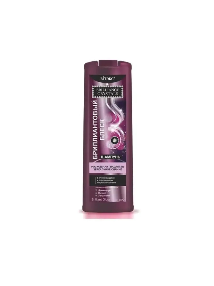 Витэкс Шампунь для волос Brilliance Crystals Бриллиантовый блеск, 500 мл 1 шт. Новейшая формула, в основе которой уникальные компоненты, превращает шампунь в настоящий эликсир сияния, который не только аккуратно и тщательно очищает волосы и кожу головы, но и дарит желанную гладкость и зеркальный блеск даже уставшим и поврежденным волосам. Современная технология жидких кристаллов в сочетании с драгоценными микрочастицами бриллиантов создает на поверхности волоса тончайшую сияющую пленку, которая питает и увлажняет, сглаживает неровности, значительно повышает светоотражающую способность и обеспечивает эффект ламинирования волос. Pro-керамиды, молекулы которых имеют минимальный размер, проникают в стержень волоса, восполняют недостаток естественного межклеточного «цемента», заполняют структурные повреждения, укрепляя волосы, возвращая им природную силу, эластичность и роскошное переливающееся сияние. Результат: шелковистые и гладкие волосы, сверкающие драгоценным бриллиантовым блеском. Дополнительные свойства: делает волосы более послушными, облегчает укладку волос, препятствует их пушению.Применение: нанесите шампунь на влажные волосы, мягко помассируйте, затем смойте водой. По желанию повторите процедуру.