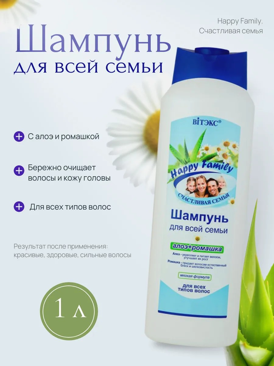 Happy Family Shampoo with aloe and chamomile gently cleanses hair and scalp without drying them out. Conditioning ingredients add strength, shine, and elasticity. Its special gentle formula provides complete care for all hair types. Aloe vera saturates hair with proteins, trace elements, and mineral salts. Hair is strengthened along its entire length, becoming stronger and accelerating its growth. Chamomile has a softening and soothing effect on the scalp, restoring hair's natural shine and strength. Results after use: beautiful, healthy, strong hair. Recommended for use with Happy Family hair conditioner.