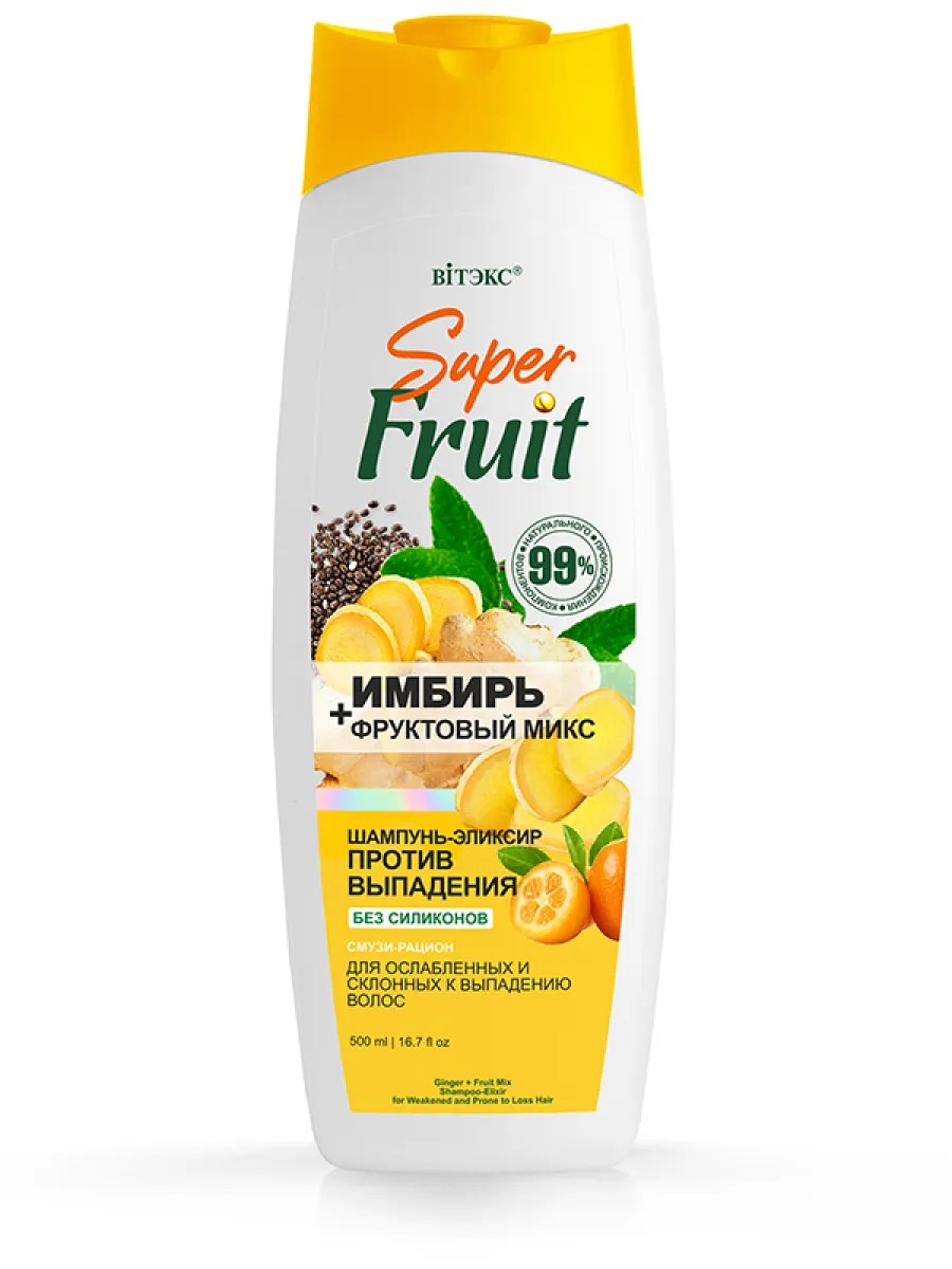 Шампунь-эликсир, разработанный экспертами ВИТЭКС по уникальной рецептуре без силиконов, сульфатов, красителей и парабенов, наполнен экстрактами 100% природного происхождения. Это очень вкусный и полезный смузи-рацион с ИМБИРЕМ и ФРУКТОВЫМ МИКСОМ из чиа, золотого апельсина, арбуза, зизифуса, кале, моринги, сезама, индийского граната и цитруса сацума для полноценного питания и укрепления волос от корней до самых кончиков. Натуральный запатентованный комплекс для роста волос останавливает выпадение волос и активизирует их рост. Кремовая пена аккуратно очищает волосы и кожу головы без пересушивания и легко без остатка смывается водой.