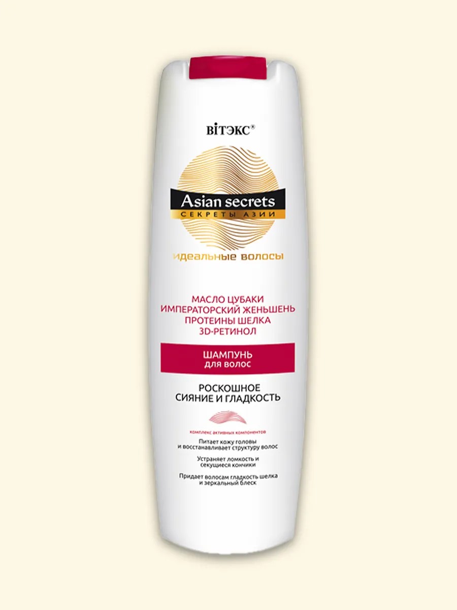 Шампунь содержит компоненты, которые ухаживают за кожей головы и восстанавливают волосы, придают им удивительную гладкость, зеркальный блеск, эластичность и упругость. Комплекс активных компонентов превосходно питает кожу головы, усиливает микроциркуляцию, уплотняет и разглаживает структуру волос, защищает от повреждений и сухости, предупреждая появление секущихся кончиков, ломкости и ослабления волос, укрепляет волосяные фолликулы и способствует росту здоровых, сильных и густых волос. При регулярном применении волосы наполняются силой, обретают атласную гладкость, становятся блестящими и шелковистыми. Масло цубаки богато витаминами A, В и Е, ненасыщенными жирами, коллагеном и антиоксидантами, превосходно питает кожу головы и восстанавливает структуру волос, насыщая их жизненной силой и возвращая природную красоту и здоровье. Восстанавливает естественный блеск волос, но и усиливает его благодаря способности мгновенно впитываться, питает волосы изнутри, предупреждая их ломкость и истончение. Императорский женьшень питает кожу головы, защищая ее от сухости и шелушения, усиливает микроциркуляцию, укрепляет волосяные фоликуллы и способствует росту здоровых, сильных и густых волос. Протеины шелка укрепляют и разглаживают структуру волос, защищают ее от повреждений, предупреждая появление секущихся кончиков, ломкости и ослабления волос, повышают их упругость и эластичность, наполняют волосы блеском. 3D-ретинол (Витамин А) стимулирует выработку кератина – главного «строительного» белка волос, делает волосы эластичными, упругими и прочными. Подходит для всех типов волос. Применение: нанесите шампунь на мокрые волосы, вспеньте массирующими движениями, тщательно смойте водой. Сделано в Беларуси.