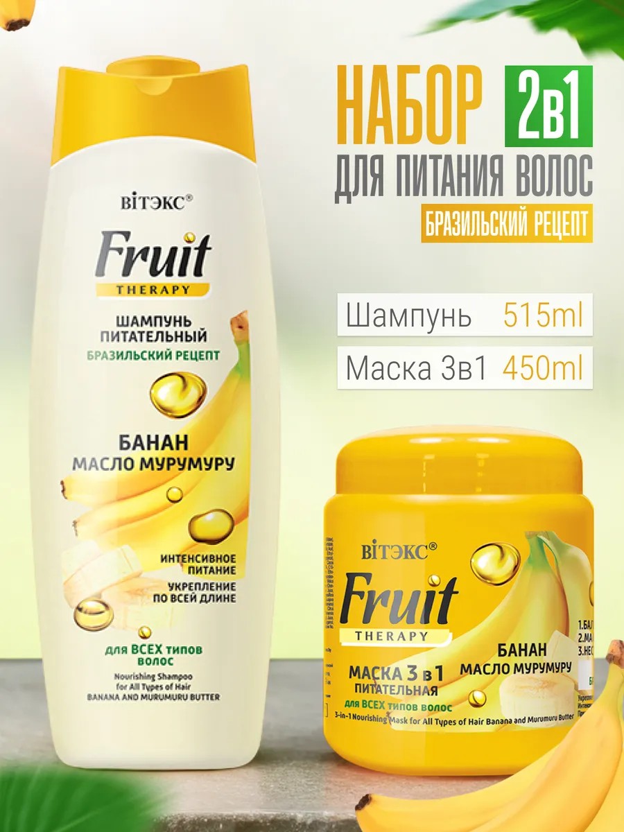 | Комплектация | Шампунь питательный Банан Fruit Therapy 515 мл. 1 шт.; Бальзам-маска 3 в 1 питательная Банан Fruit Therapy 450 мл. 1 шт. |