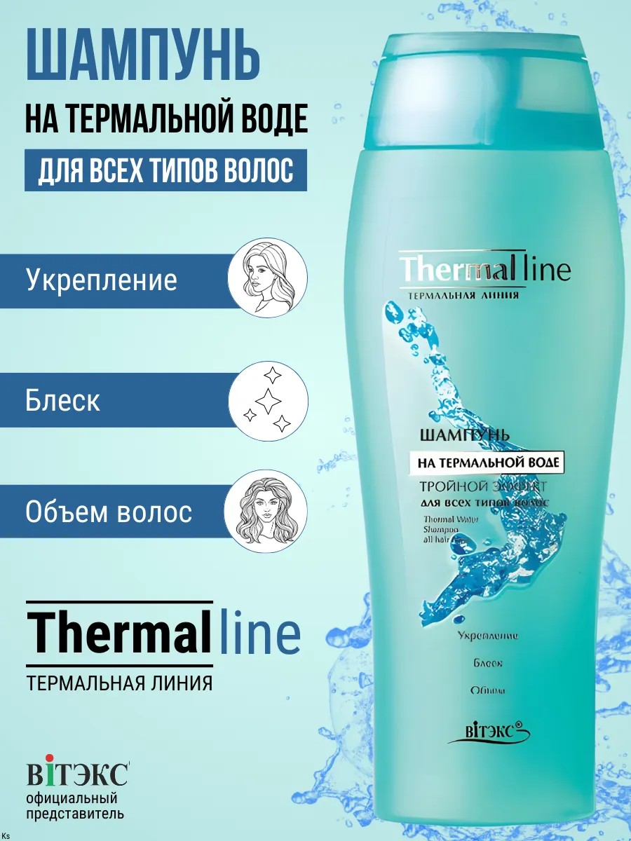 Шампунь Тройной эффект на термальной воде для всех типов волос Thermal Line от беллоруского бренда косметики Витэкс. Укрепляет корни и структуру волос, придает волосам интенсивный блеск и объем, питает и укрепляет луковицы волос. Подходит для ежедневного использования.