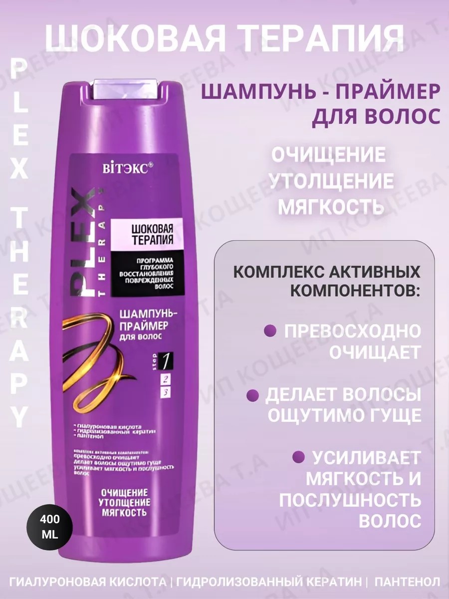 Plex Therapy Shampoo, 400 ml, Vitex. A complex of active ingredients: perfectly cleanses; makes hair noticeably thicker; enhances softness and manageability. The hair restoration process begins already from the cleansing stage. This primer shampoo deeply cleanses the hair. Active ingredients give hair amazing softness and smoothness, creating a flowing silk effect. Even damaged hair is filled with strength, becoming thicker, stronger, and more manageable. This primer shampoo is the first step in the Plex Therapy program. Its special formula enhances the effectiveness of the Shock Therapy serum and mask, promoting the penetration of active ingredients into the deepest layers of the hair.