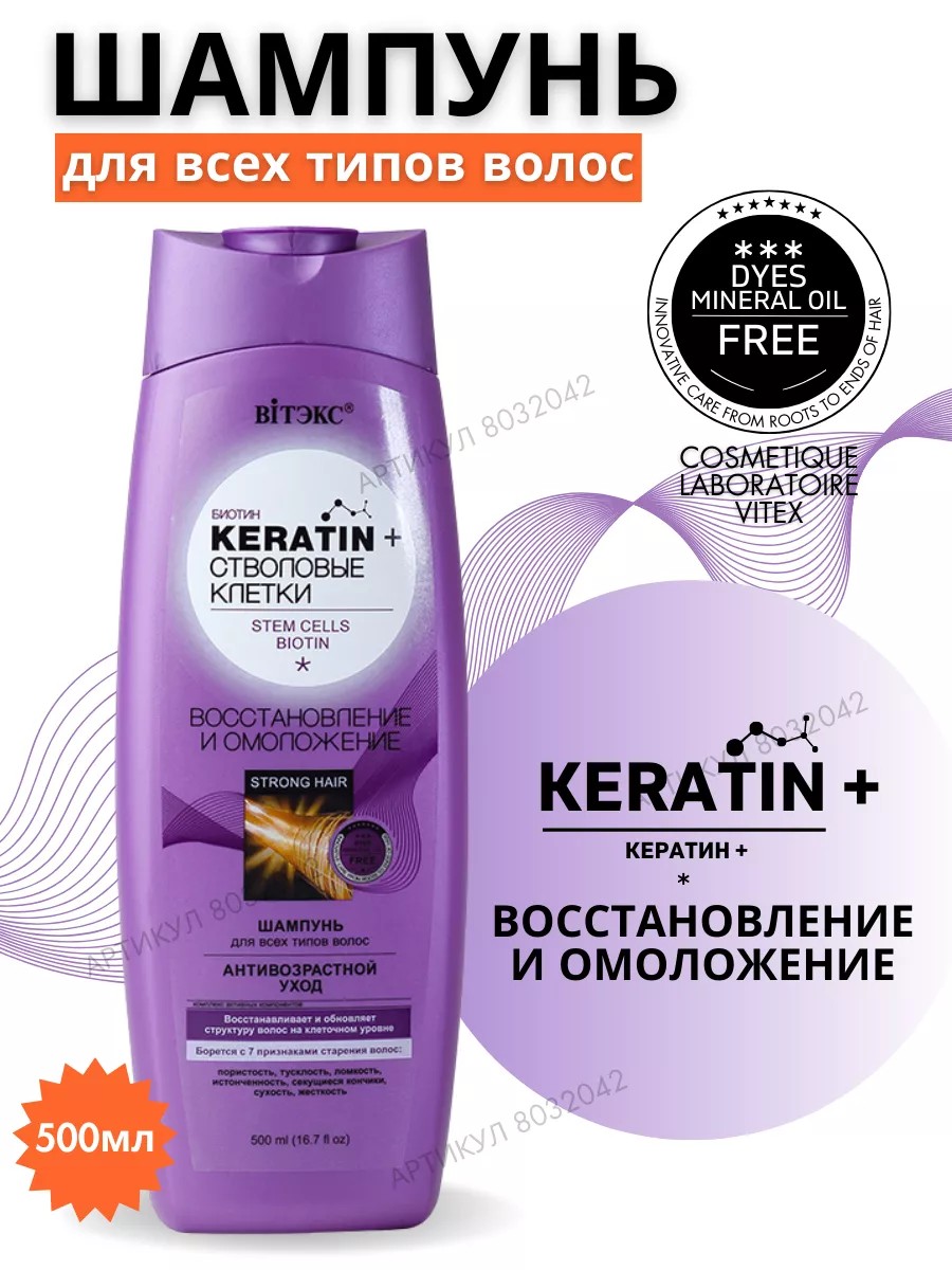 КомплектацияШампунь для волос - 1 шт; Keratin + Стволовые клетки и биотин ШАМПУНЬ для всех типов волос Восстановление и омоложение