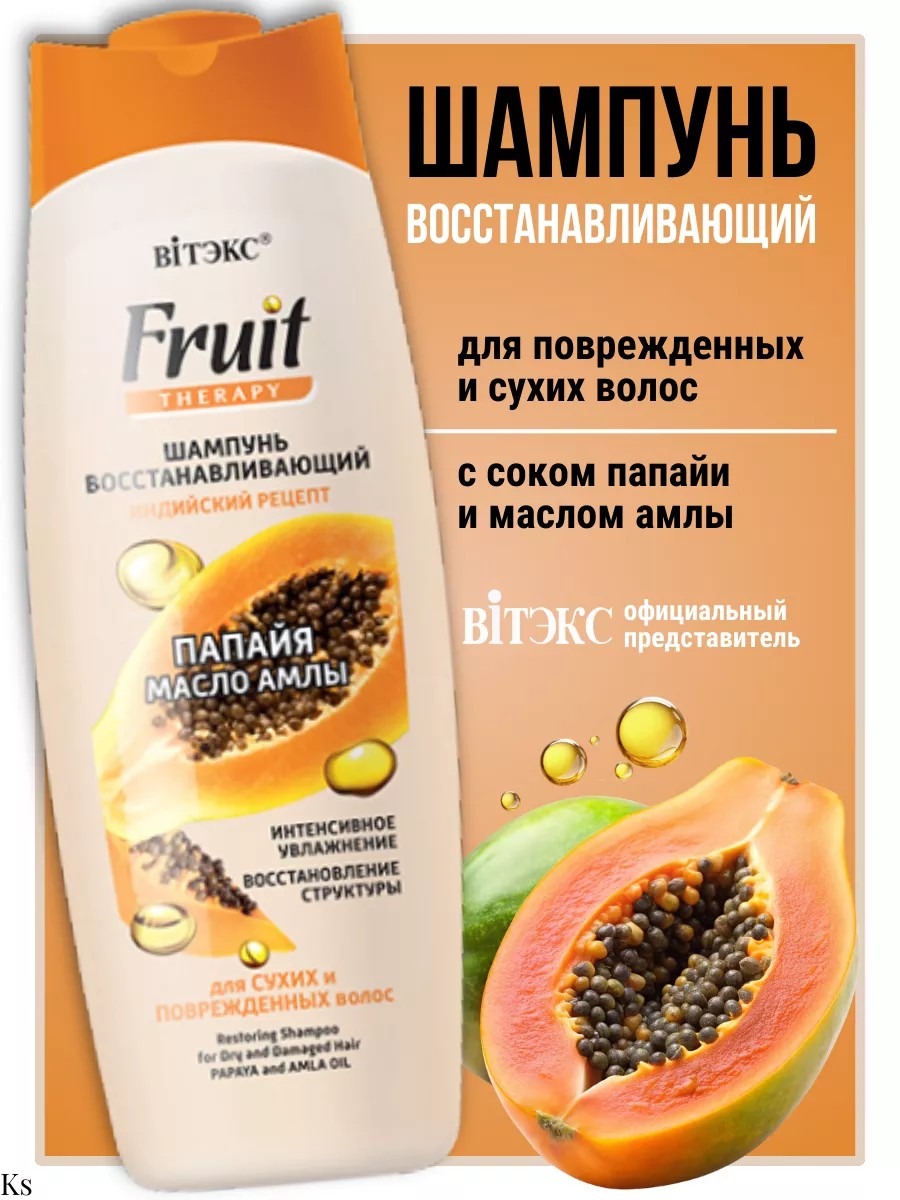 Шампунь восстанавливающий для сухих и поврежденных волос Папайя и масло амлы Fruit Therapy от белорусского бренда косметики Витэкс. Интенсивная формула шампуня, вдохновленная традиционными индийскими рецептами, сочетает восстанавливающую силу индийских фруктов и очень мягкое, аккуратное очищение волос и кожи головы. Свежайший сок спелой папайи, ценное масло амлы и эффективные ухаживающие комплексы обеспечивают волосам необходимое увлажнение и питание, заполняют микроповреждения, восстанавливают структуру и приглаживают кутикулу волос. Волосы становятся шелковистыми и послушными, приобретают красивое сияние.
