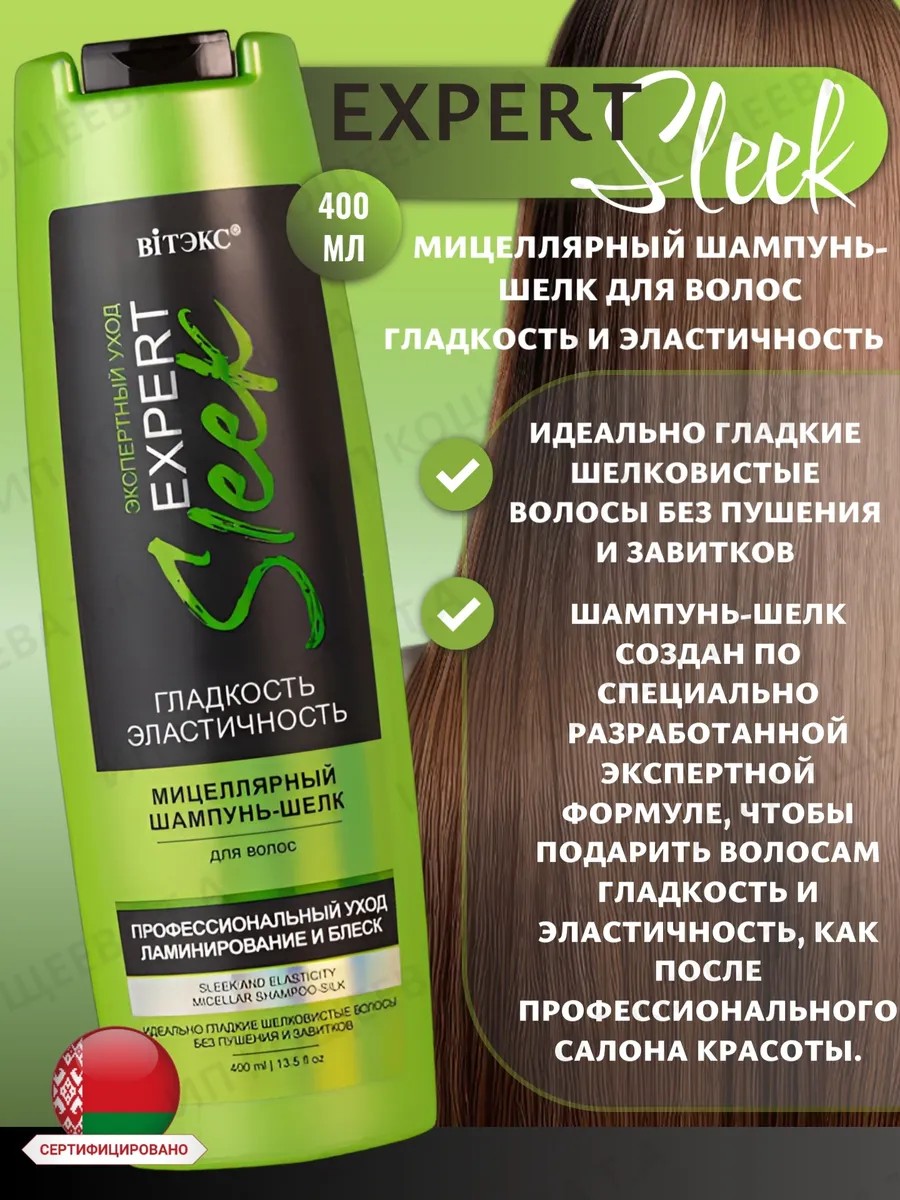Мицеллярный шампунь-шелк для волос Гладкость и Эластичность EXPERT SLEEK Витэкс .ЗЕРКАЛЬНЫЙ эффект. ИДЕАЛЬНО ГЛАДКИЕ ШЕЛКОВИСТЫЕ ВОЛОСЫ БЕЗ ПУШЕНИЯ И ЗАВИТКОВШампунь-шелк создан по специально разработанной экспертной формуле, чтобы подарить волосам гладкость и эластичность, как после профессионального салона красоты.Современная мицеллярная технология очень мягко и при этом тщательно очищает волосы и кожу головы, не пересушивая и не вызывая раздражения.АНА-кислоты и протеины шелка устраняют микроповреждения в структуре волос, разглаживают и запечатывают кератиновые чешуйки, обеспечивают волосам прочность, эластичность и шелковистость от корней до кончиков.Особый полирующий комплекс окутывает каждый волосок невесомой вуалью, которая дисциплинирует непослушные пряди, препятствует пушению и дарит волосам струящуюся гладкость и зеркальный блеск.Результат просто Wow! Идеально гладкие, волнующе шелковистые волосы с красивым сиянием! Состав: вода, лауретсульфат натрия, кокамидопропилбетаин, кокоамфодиацетат динатрия, кокамид ДЭА, диметикон, лаурет-4, лаурет-23, гликольдистеарат, амодиметикон, хлорид цетримония, тридецет-12, хлорид натрия, парфюмерная композиция, гликолевая кислота, молочная кислота, хлорид гидроксипропилтримония гуара, аминокислоты шелка, ЭДТА динатрия, бензиловый спирт, метилхлоризотиазолинон, метилизотиазолинон, кроссполимер акрилатов и C10-30 алкилакрилата, бензилсалицилат, бутилфенилметилпропиональ, гексилциннамаль, CI 15985, CI 19140.