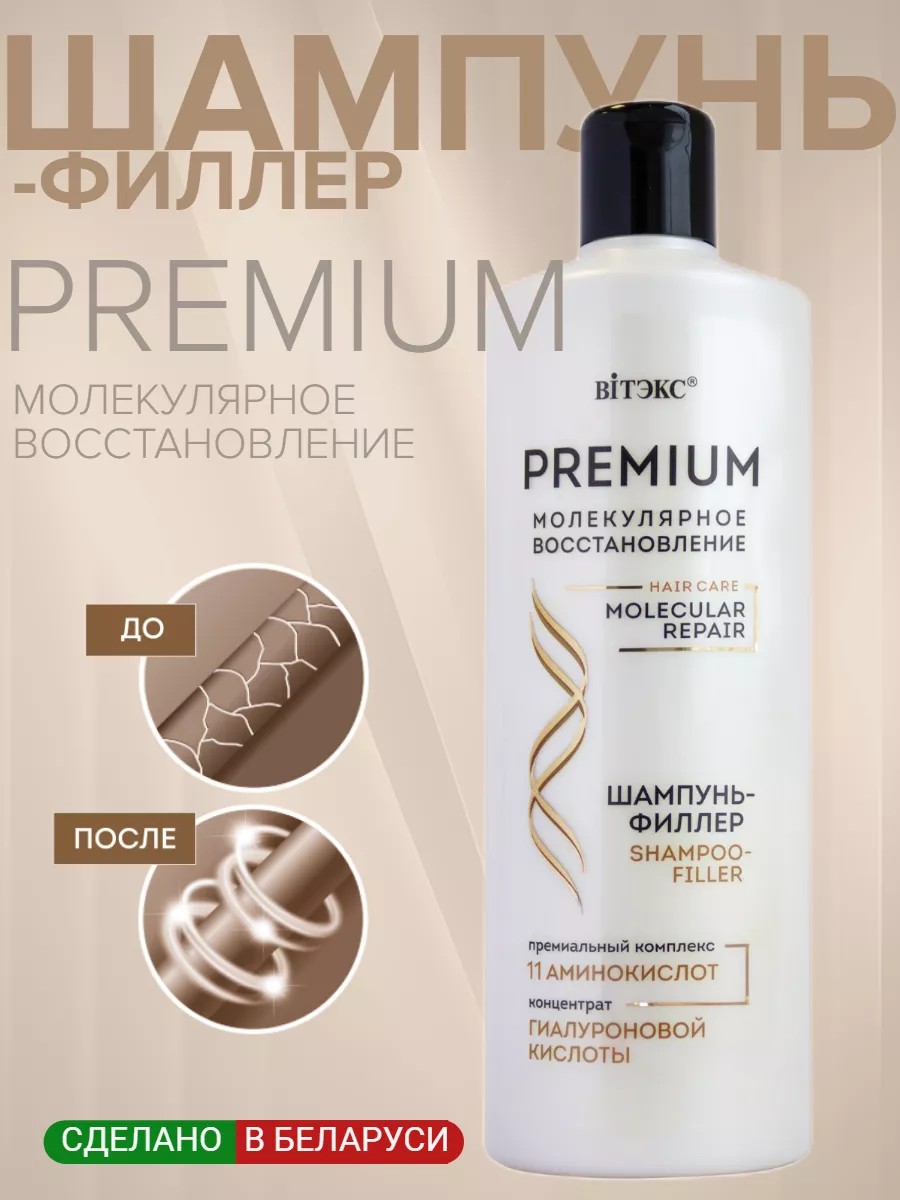 Шампунь-филлер для волос Premium молекулярное восстановление с премиум комплексом 11 аминокислот. Шампунь-филлер деликатно и при этом эффективно очищает волосы и кожу головы без пересушивания и раздражения, обеспечивая волосам премиальный восстанавливающий уход уже на этапе очищения.