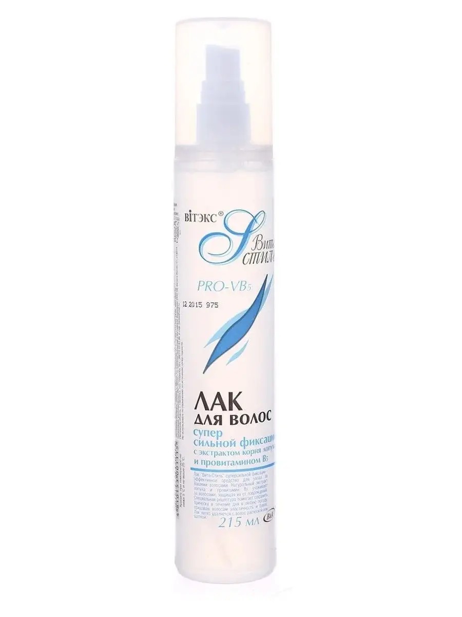 Vitex Super Strong Hold Hairspray with Burdock Extract, 215 ml. Natural burdock extract and provitamin B5 care for hair, protecting it from damage. The special formula helps maintain your hairstyle throughout the day in any weather, adding elasticity and shine. The spray is easily removed with a comb or brush. A special elastic base helps hold and maintain any hairstyle.