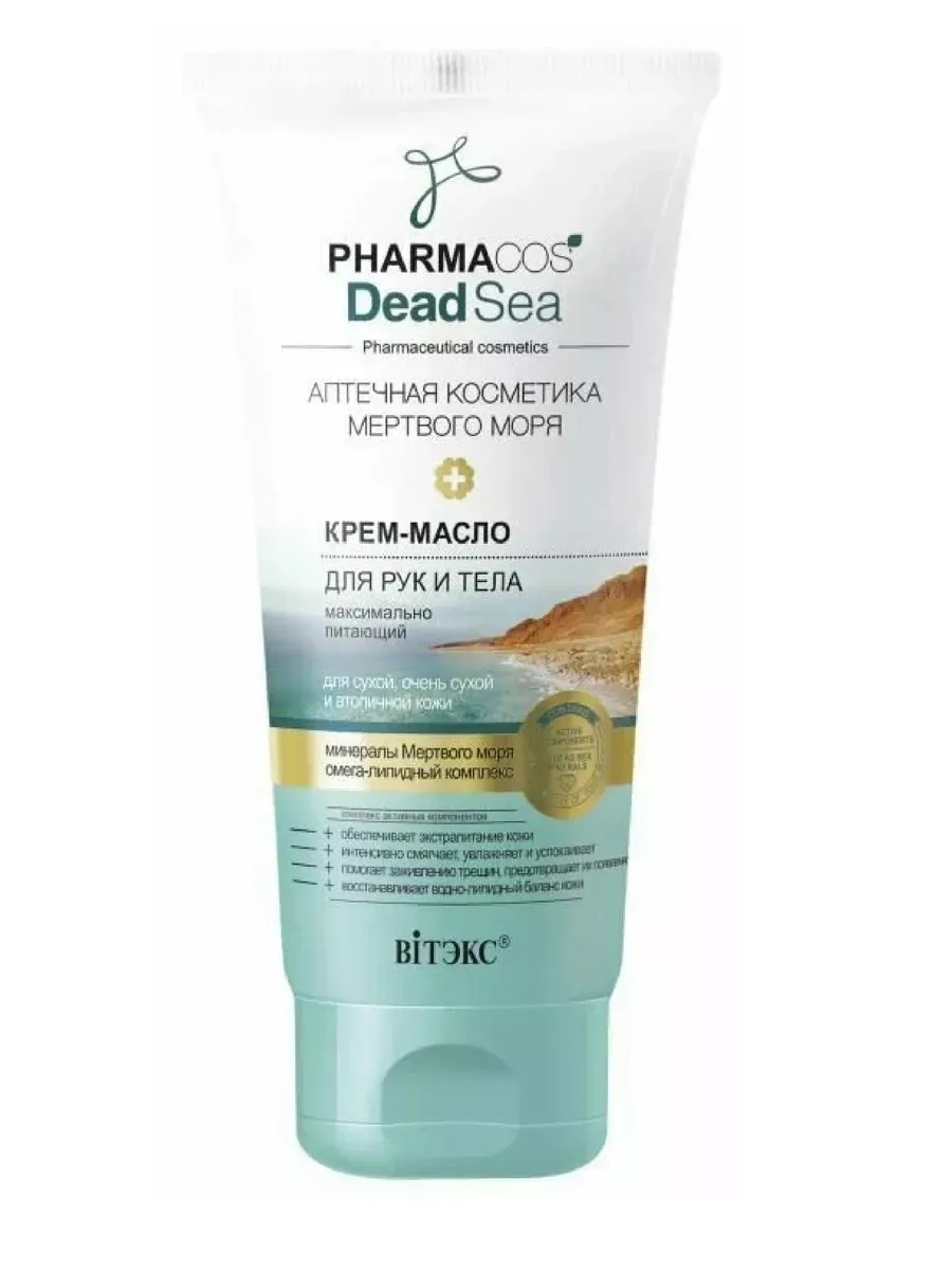 Витэкс, Крем-масло PHARMACos DEAD SEA для рук и тела питающее для сухой атопичной кожи 150 мл, 1 шт. Минералы Мертвого моря и омега-липидный комплекс обеспечивает экстрапитание кожи, интенсивно смягчает, увлажняет и успокаивает, способствует заживлению трещин, предотвращает их появление, восстанавливает водно-липидный баланс кожи. Идеальное средство для экстремального питательного, восстанавливающего, увлажняющего и успокаивающего ухода за сухой, очень сухой, атопичной кожей, а также за кожей, негативно реагирующей на воздействие различных внешних факторов (холод, ветер, пересушенность и т. д.). Целительная эссенция из 20 минералов Мертвого моря оказывает мощный оздоравливающий эффект: повышает защитные свойства кожи, тонизирует и укрепляет, улучшает плотность и эластичность кожи. Омега-кислоты «достраивают» разрушенные липидные связи, помогают восстановить коллаген-эластиновую матрицу кожи для профилактики преждевременного старения, способствуют заживлению трещин и препятствуют их появлению. Ценные масла кунжута, бабассу, какао и кокоса глубоко питают клетки витаминами, антиоксидантами и аминокислотами, эффективно смягчают и разглаживают кожу, снижают реактивность кожи и склонность к раздражениям и покраснениям. Натуральный увлажнитель Hydrovance и сорбитол дополняют и усиливают действие друг друга: моментально возвращают ощущение комфорта, снимают ощущение стянутости и сухости, глубоко увлажняют кожу.