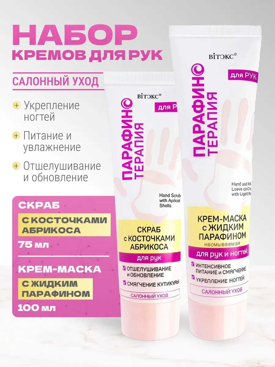 | Комплектация | Крем для рук с парафином - 1шт; Скраб с абрикосовыми косточками - 1 шт; витекс |