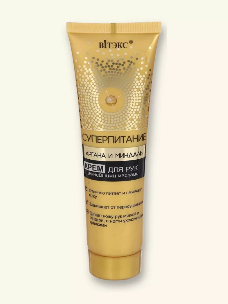 Крем для рук с ценнейшими маслами 100 мл. Отлично питает и смягчает кожу. Защищает от пересушивания. Делает кожу рук мягкой и гладкой, а ногти ухоженными и крепкими. Крем великолепно подходит для ежедневного питания и увлажнения кожи рук. Богатая формула с высокой концентрацией натуральных масел арганы, сладкого миндаля и кокоса обеспечивает интенсивное питание и восстановление гидролипидной мантии нежной кожи рук. Глицерин эффективно увлажняет, предотвращает пересушивание кожи. Крем образует на коже невидимую дышащую пленку, создавая эффект «второй кожи», эффективно защищает кожу от негативных воздействий окружающей среды. Легко впитывается, не оставляя ощущения липкости. Применение: нанесите крем на чистую кожу рук, помассируйте до полного впитывания. Сделано в Беларуси.