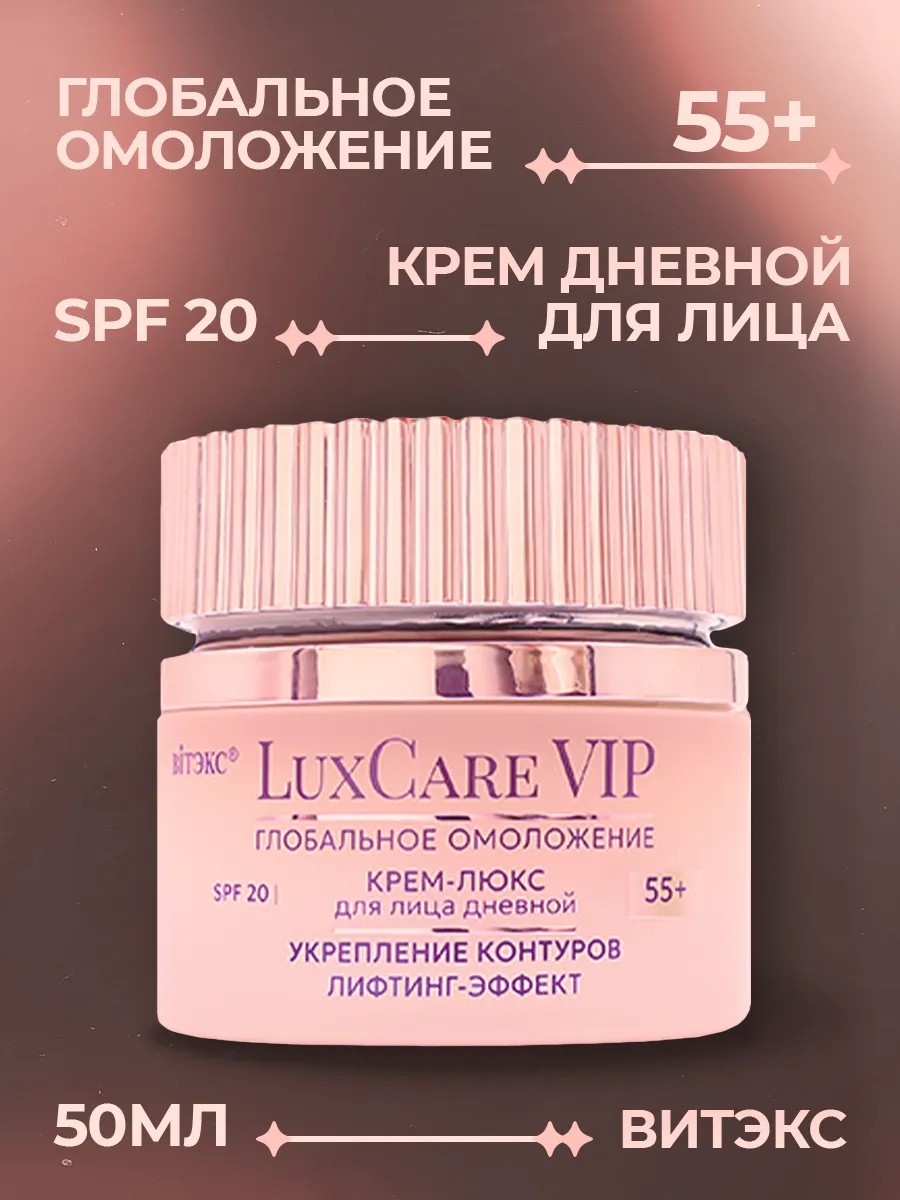 Крем-люкс для лица дневной 55+ укрепление контуров, лифтинг-эффект, SPF 20 «LuxCare VIP глобальное омоложение» от белорусского бренда Витекс — это идеальный выбор для ухода за зрелой кожей. Увлажняющий крем для лица антивозрастной создан с учетом потребностей кожи после 55 лет и обеспечивает комплексное увлажнение и питание. Эксклюзивный коктейль компонентов с интенсивным антивозрастным действием работает на всех уровнях эпидермиса и быстро делает кожу визуально моложе: разглаживает, подтягивает, освежает, придает сияние упругости. Сразу после нанесения крема на коже образуется невесомая омолаживающая вуаль, которая оказывает подтягивающее и разглаживающее действие. Крем для лица увлажняющий и питательный активно борется с морщинами, восстанавливая упругость и тонус кожи. Антивозрастной уход за лицом, содержащий экстракты масел жожоба, подсолнечника, кукурузы и макадамии, глубоко питает и увлажняет, придавая коже здоровое сияние. Уходовая косметика для лица благодаря содержанию ниацинамида и ацетилглюкозамина, этот крем для лица способствует улучшению текстуры кожи, делая её более гладкой и упругой. Лифтинг-эффект помогает укрепить контуры лица, придавая им четкость и выразительность. Крем для лица с спф 20 обеспечивает надежную защиту от вредного воздействия ультрафиолетовых лучей, что особенно важно для зрелой кожи. Уходовая косметика для лица «LuxCare VIP» не только защищает, но и активно восстанавливает, благодаря наличию мощных антиоксидантов, таких как астаксантин и токоферилацетат. Белорусская косметика линии LUXCARE VIP премиальное качество – быстрое уменьшение возрастных изменений, стойкий выраженный эффект омоложения. Дневной крем для лица 55+ станет вашим верным помощником в борьбе с признаками старения, обеспечивая глубокое увлажнение и питание на весь день. Подарите своей коже заботу и внимание с питательным кремом от Vitex, который подарит вам ощущение свежести и комфорта. Увлажнение, питание и защита — всё это в одном флаконе!
