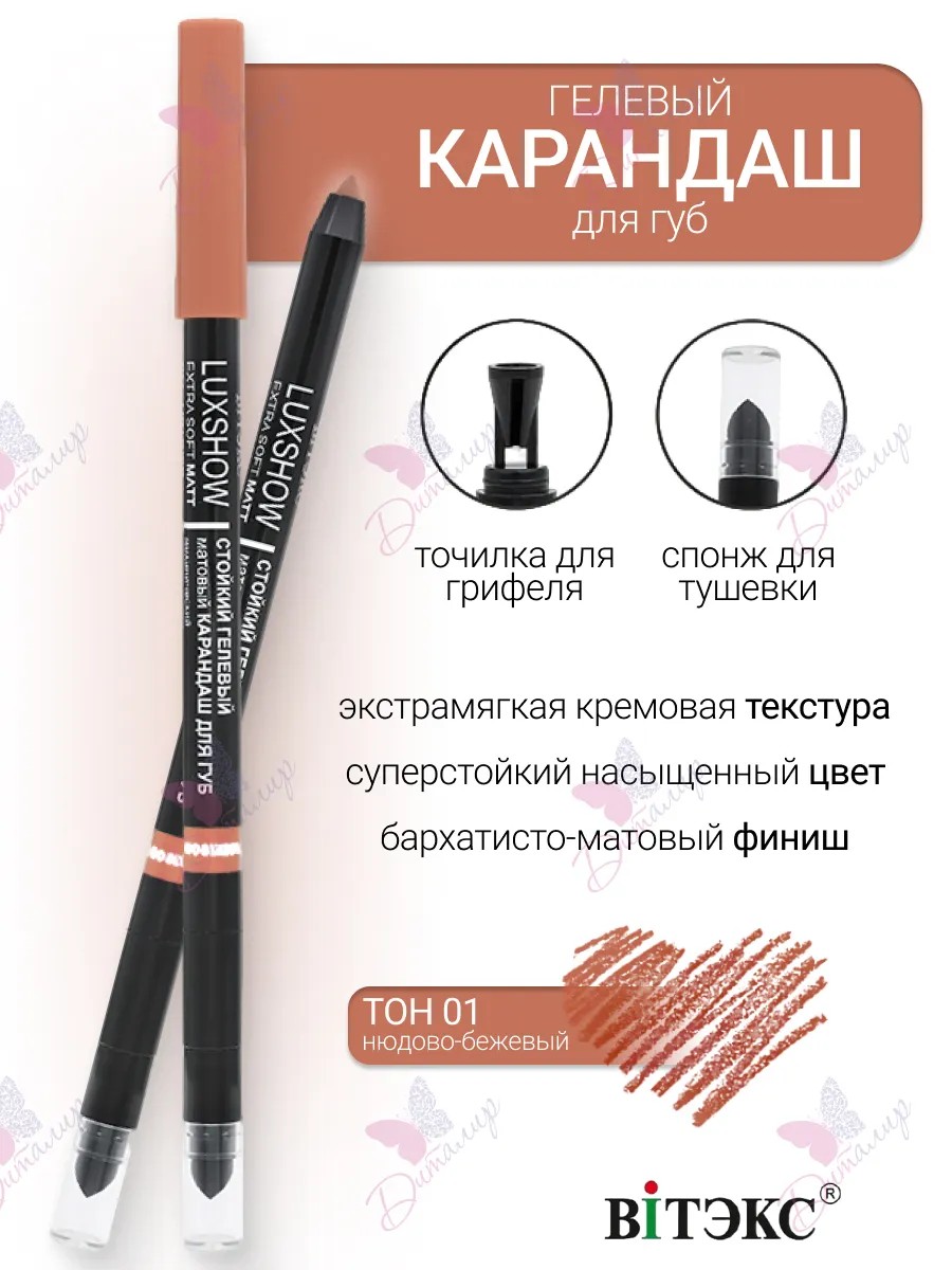 Luxshow long-lasting matte gel lip pencil. Super-long-lasting, rich color. Extra-soft, creamy texture. Premium decorative cosmetics. This luxurious gel pencil with a highly pigmented formula gives lips rich color, beautifully defines lips, gently plumps thin lips, and adds desired volume and fullness. The super-long-lasting formula with wax microcrystals glides smoothly over the skin, prevents lipstick or gloss from smudging and bleeding, helping keep lip makeup perfect all day long. The extra-soft, creamy texture won't dry out skin, won't accentuate dry spots, won't feather, and won't settle into fine lines and wrinkles. A built-in sharpener lets you sharpen the tip as sharply as you need, and the blending sponge allows for easy and even blending. • super-long-lasting, rich color • extra-soft, creamy texture • luxurious velvety-matte finish • does not dry out or tighten the skin of the lips • built-in sponge for blending • built-in pencil sharpener.