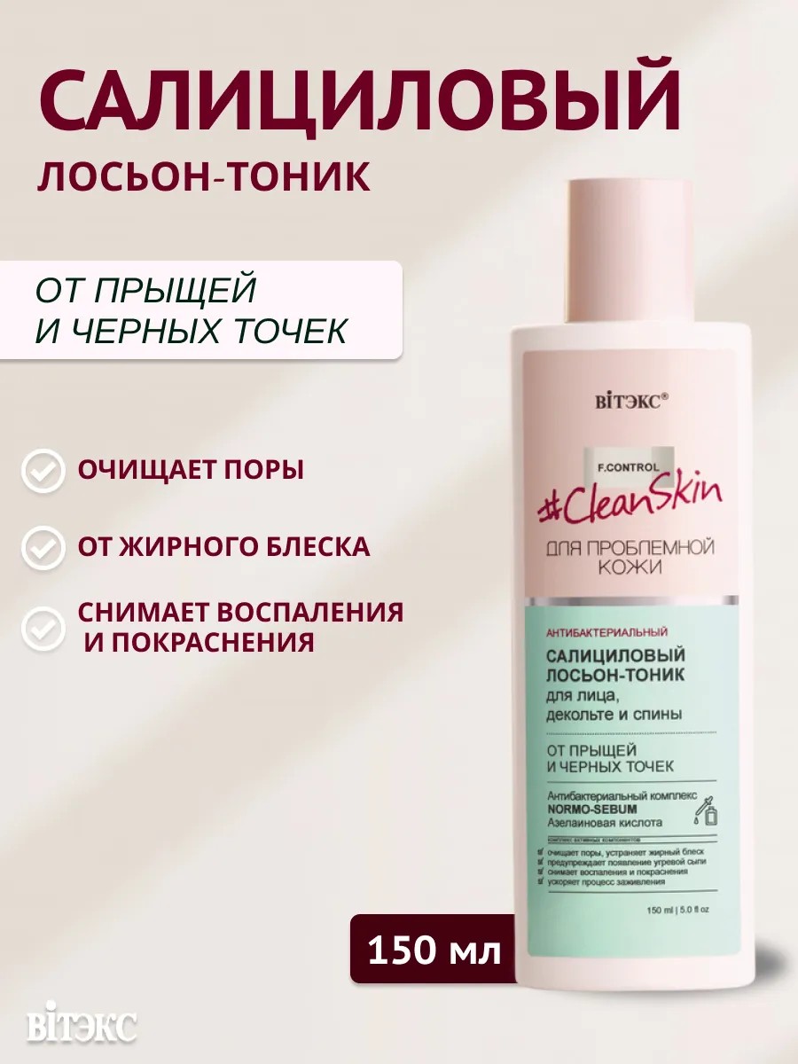 Лосьон-тоник Clean Skin для лица, декольте и спины мощное средство для борьбы с прыщами и черными точками от белорусского бренда Витекс имеет выраженный противомикробный эффект, очищает поры, устраняет жирный блеск, предупреждает появление угревой сыпи, снимает воспаления и покраснения, ускоряет процесс заживления.