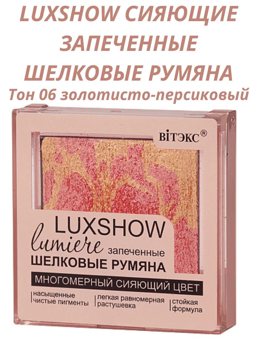 Полное наименование товараLUXSHOW сияющие запеченные шелковые румяна тон 06 золотисто-персиковый 4,5 г