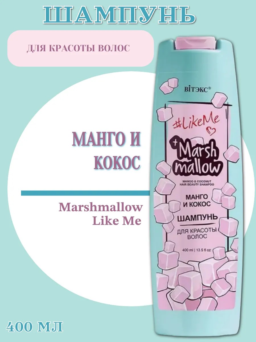 Шампунь для волос Витэкс LikeMe Marshmallow Манго и кокос 400 мл. - дает очищающий и освежающий уход кондиционера для волос. Его пушистая, кремовая пена бережно очищает волосы и оставляет восхитительно ароматный шлейф. В нем столько целебных компонентов, что твои волосы будут каждый день восхищать тебя и окружающих своей шелковистостью, свежестью и красивым блеском.
