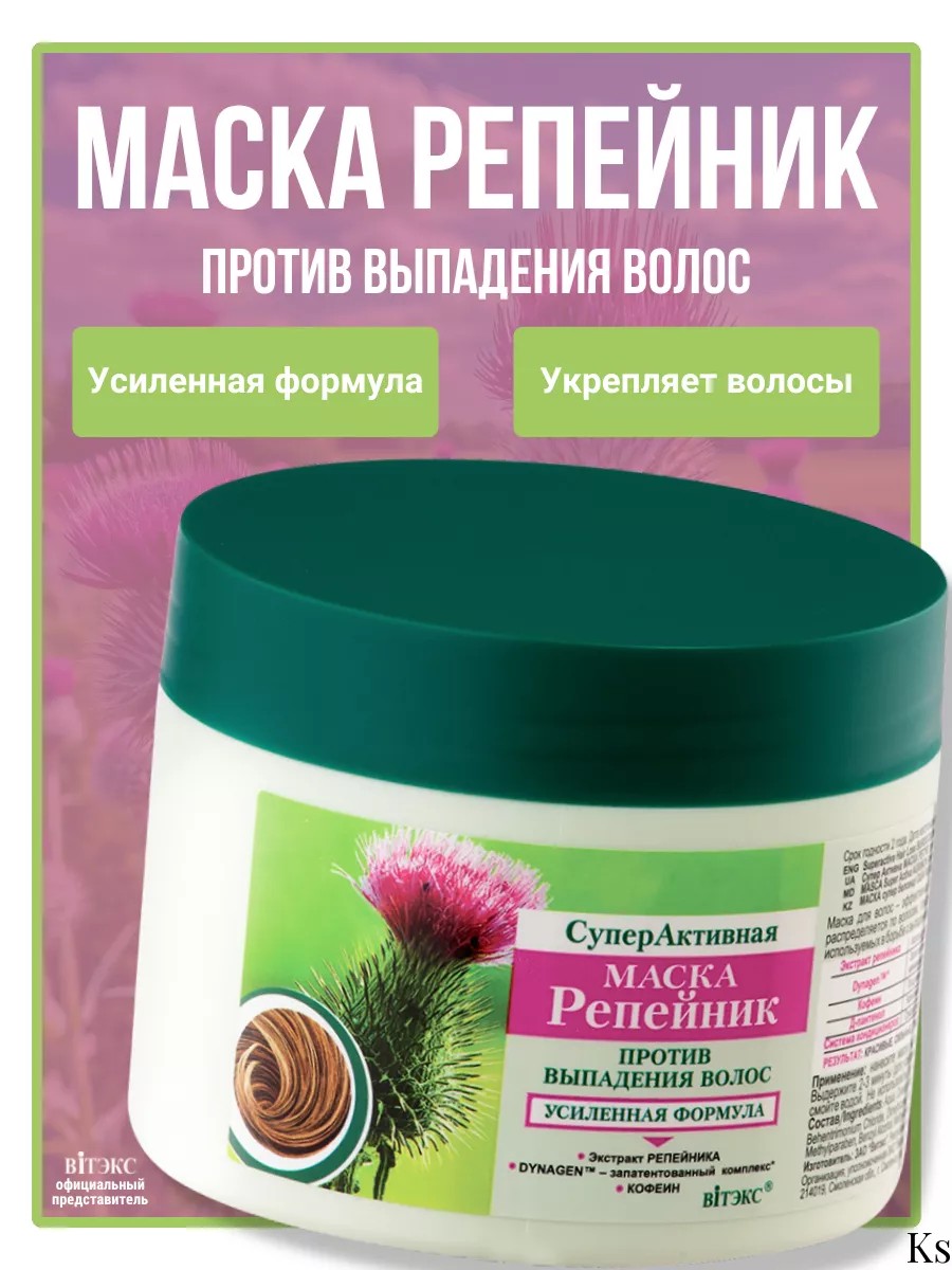 Экстракт репейника издавна славится своими уникальными свойствами. Косметические средства, разработанные на основе этого компонента, действенно приостанавливают процесс выпадения волос и дарят локонам силу и здоровье. Специалисты из компании Витэкс разработали замечательную серию косметических средств, предназначенную для решения проблем, связанных с выпадением волос. Эта маска была разработана компанией Витэкс на основе комплекса растительных экстрактов и запатентованного компонента Dynagen, способствующего укреплению прядей и надежно защищающего волосы от выпадения. Действие препарата также было усилено кофеином, призванным оздоравливать волосяные луковицы и нормализовать рост здоровых волосков.