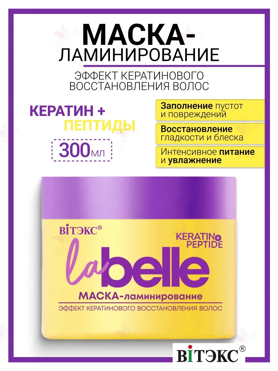 La Belle Lamination Mask: Keratin Hair Restoration Effect with Keratin and Peptides. Intensive nourishment - filling voids and damage - maximum hydration - restoring smoothness and shine - making hair easier to comb - preventing split ends and breakage. The first Vitex mask to use a peptide method for a salon-quality keratin restoration effect. The mask's rich composition of active ingredients reconstructs hair from the inside and out, seals split ends, protects hair from further damage, and restores unrivaled smoothness and shine. How hair lamination ingredients work. Sh-oligopeptide-78 significantly reduces protein loss in the hair structure, reduces breakage, prevents split ends, and adds strength, elasticity, and bounce to curls. 11 amino acids stimulate ceramide synthesis, restore hair structure, making it resistant to damage, and add volume, shine, and radiance. Hydrolyzed collagen and keratin repair microdamage along the entire length of the hair, smoothing the cuticle along the entire length, providing the effect of salon-quality keratin straightening. A complex of ultra-nourishing oils infuses hair with valuable ingredients for silkiness, elasticity, and smoothness. Suitable for porous, fine, curly, color-treated, bleached, and other hair types. The more severe the damage, the more noticeable the results! Directions: Apply to washed, damp hair and scalp, leave on for 3-4 minutes, and rinse with water.