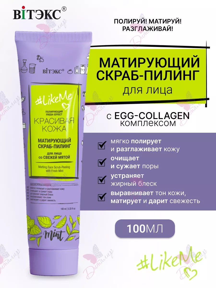 Likeme Mattifying Facial Scrub and Peel with Fresh Mint. Vitex. Polish! Mattify! Smooth! This scrub and peel deeply cleanses and evens out your complexion thanks to a combination of exfoliating and sebum-regulating techniques: 1. Scrubbing and massaging with natural microgranules to gently polish the skin and improve elasticity. 2. Renewing with glycolic acid to even out skin tone and smooth the skin. 3. Mattifying with natural ingredients to eliminate shine and keep your skin looking fresh all day long. Fresh mint refreshes and tones the skin, helps tighten pores, and improves complexion. Glycolic acid effectively and gently exfoliates dead skin cells, moisturizes and smoothes the skin, evens out the microrelief, and leaves it smooth and silky. A natural apricot kernel scrub complex deeply cleanses pores and gently massages the skin, activating metabolic processes in the epidermis, accelerating skin renewal, and improving cellular respiration. Phytotal os deeply cleanses the skin, reducing pore size, regulating sebum secretion, and restoring the skin's natural balance. Egg-collagen complex infuses the skin with collagen and other valuable substances, intensively nourishes and moisturizes, reduces irritation and inflammation, promotes healing, smoothes, and maintains skin elasticity. Ginger tones the skin, improves its elasticity and density, and stimulates regeneration. D-panthenol has a healing and softening effect. Directions: Apply to face, avoiding the eye area, massage in, and rinse with water. Use 1-2 times a week.