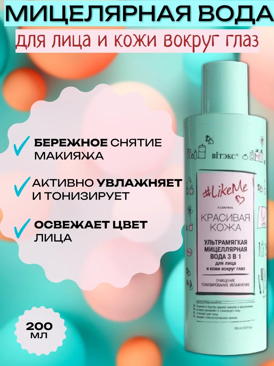 Витэкс LikeMe Мицеллярная вода 3в1 200мл Ультрамягкая. Ультрамягкая мицеллярная вода бережно очищает молодую кожу и ухаживает за ней, позволяет в одно касание снять макияж с лица, глаз и губ, очищает поры, увлажняет и тонизирует.