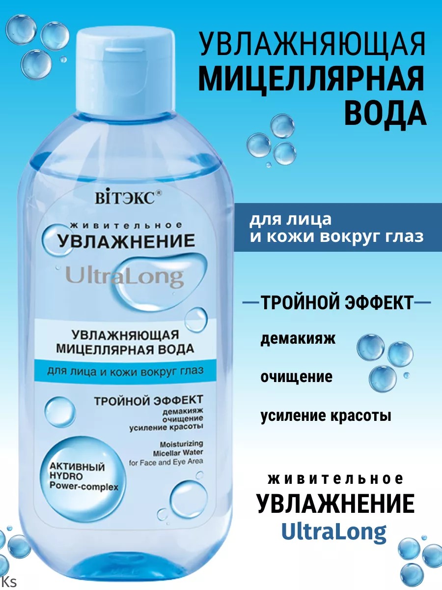 Увлажняющая мицеллярная вода для лица и кожи вокруг глаз Живительное увлажнение от белорусского бренда косметики Витэкс с системой long-effect действует одновременно в трех направлениях, обеспечивая коже мгновенное ощущение комфорта, свежести и чистоты. Формула с активным мицеллами полностью растворяет макияж и загрязнения, легко и аккуратно очищая кожу без лишнего трения. Состав обогащен специально разработанным увлажняющим комплексом HYDRO Power-complex, который насыщает кожу влагой, тонизирует, делает цвет лица ярким, ровным и сияющим. Результат: чистая, увлажненная кожа, которая светится свежестью и красотой. Подходит для чувствительных глаз. Применение: нанесите средство для демакияжа на ватный диск, очистите кожу. Не требует дополнительного умывания.