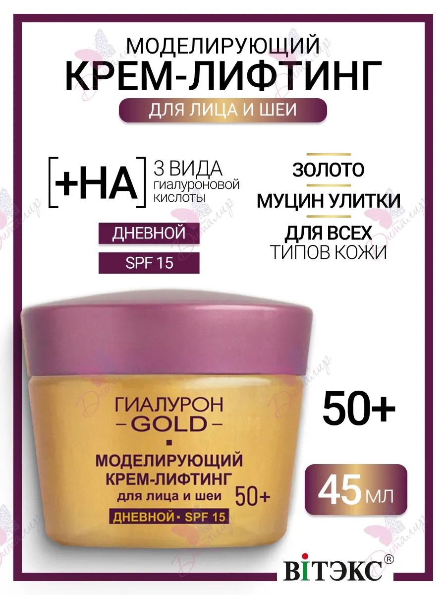 Моделирующий крем-лифтинг для лица и шеи SPF 15, дневной 50+ Гиалурон GOLD. Моделирующий дневной крем-лифтинг создан с учетом особенностей и потребностей кожи в возрасте после 50 лет. Интеллектуальная богатая формула, основанная на 3 видах гиалуроновой кислоты, включает биозолото, муцин улитки, ультрапитательные масла авокадо и жожоба и работает на трех уровнях эпидермиса (верхнем, среднем и глубинном), оказывая выраженное омолаживающее действие. Эффект разглаживания морщин и подтягивания овала лица возникает мгновенно и сохраняется в течение всего дня. Гиалуроновая кислота трех молекулярных размеров проникает во все слои эпидермиса, активизируя глубокий клеточный метаболизм и возрождая ресурс молодости кожи. 1. Высокомолекулярная гиалуроновая кислота увлажняет кожу в верхних слоях. 2. Среднемолекулярная гиалуроновая кислота проникает в средние слои кожи. 3. Низкомолекулярная гиалуроновая кислота действует в самых глубоких слоях эпидермиса, укрепляя и подтягивая контуры лица, обеспечивает мощный и продолжительный эффект лифтинга. Применение: нанесите утром на очищенную кожу лица и шеи.
