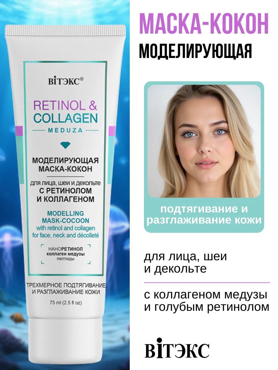 Линия RETINOL&COLLAGEN meduza - современное поколение омолаживающего ухода. Исключительная маска с нежной шелковистой текстурой подобно "кокону" нежно обволакивает кожу и обеспечивают трехмерное разглаживание и подтягивание кожи. Наноретинол помогает обновить и восстановить кожу, стимулирует синтез коллагена, уменьшает морщины, улучшает цвет лица. Коллаген медузы и пептиды создают на поверхности кожи трехмерную сеточку для подтягивания и разглаживания, замедляют процесс старения. V-lift компоненты обеспечивают выраженный лифтинг-эффект, обеспечивая четкость контурам лица и шеи. Fucogel устраняет дефицит влаги в клетках, увеличивая упругость и эластичность кожи.