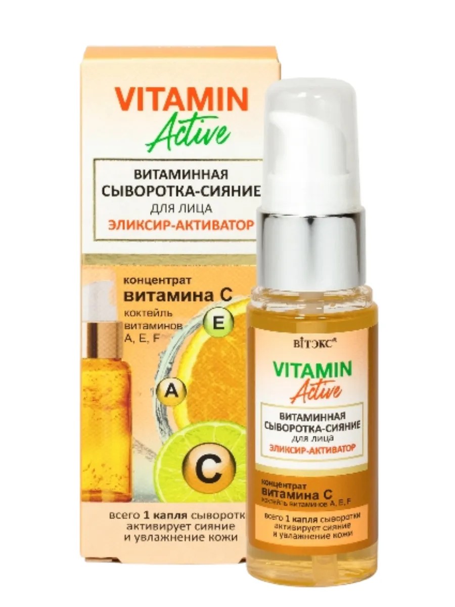 Витаминная сыворотка-сияние для лица эликсир-активатор «VITAMIN ACTIVE» от белорусского бренда Витекс — это инновационное средство для ухода за кожей, созданное для интенсивного увлажнения и осветления. Уходовая косметика для лица разработана с учетом потребностей кожи и подходит для всех типов, особенно для тех, кто хочет справиться с проблемами пигментации и акне. Сверхлегкая, свежая, идеально совместимая с кожей сыворотка для лица увлажняющая – это настоящий концентрат витаминной энергии для глубокого увлажнения и красивого сияния кожи. Насыщенная и одновременно невесомая текстура содержит витамин C в оптимальной концентрации, который, благодаря стабилизированной форме, длительное время сохраняет высокую активность и, проникая в кожу. Увлажняющая сыворотка для лица содержит гиалуронат натрия и глицерин, которые обеспечивают глубокое увлажнение, делая кожу мягкой и гладкой. Сыворотка с витамином С помогает осветлить тон кожи, уменьшить пигментные пятна и придать сияние. Сыворотка от акне с экстрактом растений, таких как имбирь и зизифус, обладают противовоспалительными свойствами, что делает сыворотку эффективной в борьбе с прыщами и высыпаниями. Осветляющая сыворотка уход за лицом с экстрактом арбуза и каламондина, способствуют выравниванию тона кожи и уменьшению видимости пигментации. Легкая текстура сыворотки быстро впитывается, не оставляя жирного блеска, что делает её идеальным средством для ежедневного ухода за лицом. Белорусская косметика линии «VITAMIN ACTIVE» – это настоящий кладезь полезных компонентов для кожи. Сыворотка от прыщей станет вашим незаменимым помощником в уходе за кожей, даря ей здоровье, свежесть и сияние. Используйте витаминную сыворотка-сияние от Vitex для достижения заметных результатов и улучшения состояния вашей кожи!