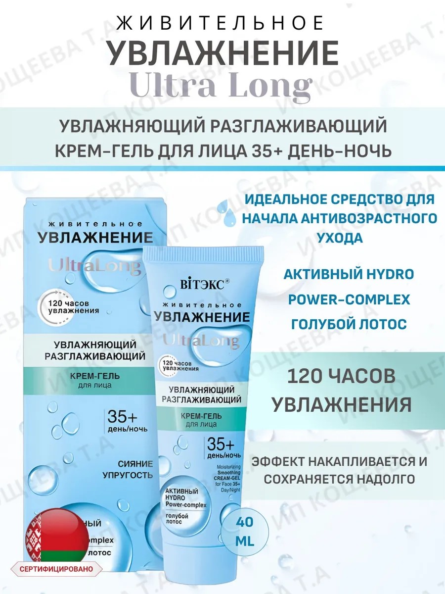 Vitex UltraLong Day-Night Moisturizing Smoothing Face Cream-Gel 35+. This silky gel cream-gel represents a new generation of moisturizing textures, developed by Vitex experts in collaboration with French scientists. The innovative HYDRO Power-complex guarantees continuous ultra-hydration for up to 120 hours: it restores and maintains moisture balance, protecting the skin from negative environmental impacts and dryness. Blue lotus stimulates cell renewal, strengthens the epidermal barrier, reduces signs of fatigue, lack of sleep, and stress, and restores a fresh, radiant appearance. Sea grape and macadamia oil saturate cells with essential nutrients and moisturizers, increasing skin firmness, elasticity, and density, while preventing the appearance of wrinkles. The effect is cumulative and long-lasting. Proven by Provital (France). Result: Immediately after applying the cream, skin is hydrated and plumped, becoming beautifully radiant and smooth. Directions: Apply morning and/or evening to cleansed skin. You can reapply the cream to the driest areas. Ingredients: Water, Cetyl Alcohol, Isostearyl Isostearate, Potassium Cetyl Phosphate, Cetyl Behenate, Behenic Acid, Cyclopentasiloxane, Cyclohexasiloxane, Glycerin, Dicaprylyl Carbonate, Dimethicone Crosspolymer, Amylopectin, Lithothamnion Calcareum (Red Algae) Extract, Pentylene Glycol, Lactic Acid, Xanthan Gum, Macadamia Integrifolia (Macadamia) Seed Oil, PPG-15 Stearyl Ether, Glyceryl Stearate, Glyceryl Tricaprylate/Caprate, Ammonium Acryloyldimethyl Taurate/VP Copolymer, Algae Extract, Codium Fragile (Sea Grape) Extract, Sodium Hyaluronate, Nelumbo Nucifera (Lotus) Flower Extract, Nelumbo Nucifera (Lotus) Seed Extract Nucifera (lotus) seed oil, phenoxyethanol, methylparaben, ethylparaben, propylparaben, parfum (fragrance), isopropyl myristate, triticum vulgare (wheat) germ oil, tocopheryl acetate, BHT, 2-bromo-2-nitropropane-1,3-diol.