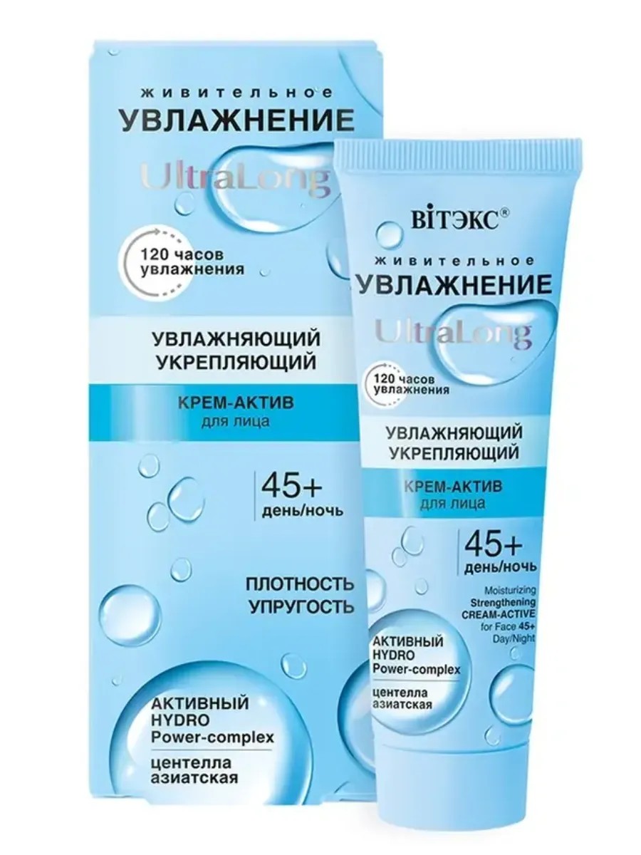 Увлажняющий укрепляющий крем-актив для лица 45+ день-ночь «Увлажнение. UltraLong» от белорусского бренда Витекс — это идеальное средство для комплексного ухода за зрелой кожей. Уходовая косметика для лица обладает мощными увлажняющими и питательными свойствами, что делает его незаменимым в ежедневном уходе за кожей. Уникальная насыщенная и в то же время нежная формула легко впитывается в кожу, доставляя увлажняющие ингредиенты в глубокие слои. Благодаря большому проценту активных компонентов в составе достигается быстрый и заметный результат: кожа напитывается влагой буквально на глазах, разглаживаются морщинки, вызванные чрезмерной сухостью, тон лица выравнивается. Увлажняющий крем для лица антивозрастной включает гиалуронат натрия и глицерин, которые глубоко увлажняют кожу, обеспечивая ей комфорт и мягкость на весь день. Антивозрастной уход за лицом с экстрактом центеллы и иглицы, способствуют уменьшению морщин и улучшению упругости кожи, делая её более молодой и свежей. Крем от морщин для лица с маслом жожоба и макадамии насыщают кожу необходимыми витаминами и жирными кислотами, поддерживая её здоровье и красоту. Экстракт красных водорослей и токоферилацетат защищают кожу от негативного воздействия окружающей среды, укрепляя её защитные функции. Крем для лица увлажняющий разработан с учетом потребностей зрелой кожи, его легкая текстура делает его подходящим для всех типов кожи. Белорусская косметика линии «UltraLong» идеально подходит как для утреннего, так и для вечернего ухода, обеспечивая коже интенсивное увлажнение и питание в любое время суток. При регулярном применении устраняется дефицит влаги во всех слоях эпидермиса, уменьшаются морщинки, замедляются возрастные изменения, улучшается плотность и гладкость кожи. Используйте крем для сухой кожи лица от Vitex как часть своего антивозрастного ухода, чтобы вернуть коже сияние, молодость и упругость. Насладитесь эффектом увлажняющего и питательного крема, который заботится о вашей коже каждый день!